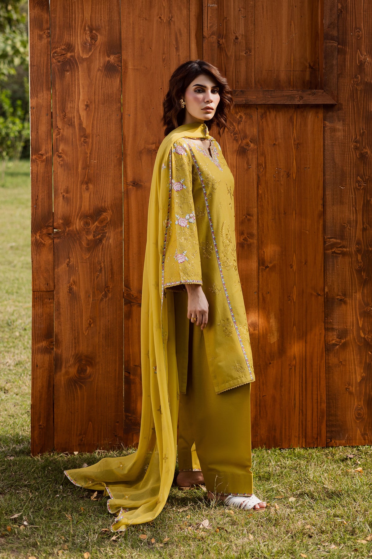 Make an elegant statement with this short paneled khaddar shirt, featuring a contrasting embroidered neckline that adds depth and character. The front showcases self-embroidered panels that bring subtle texture, while the fully embroidered sleeves enhance the design with refined craftsmanship and intricate detailing.