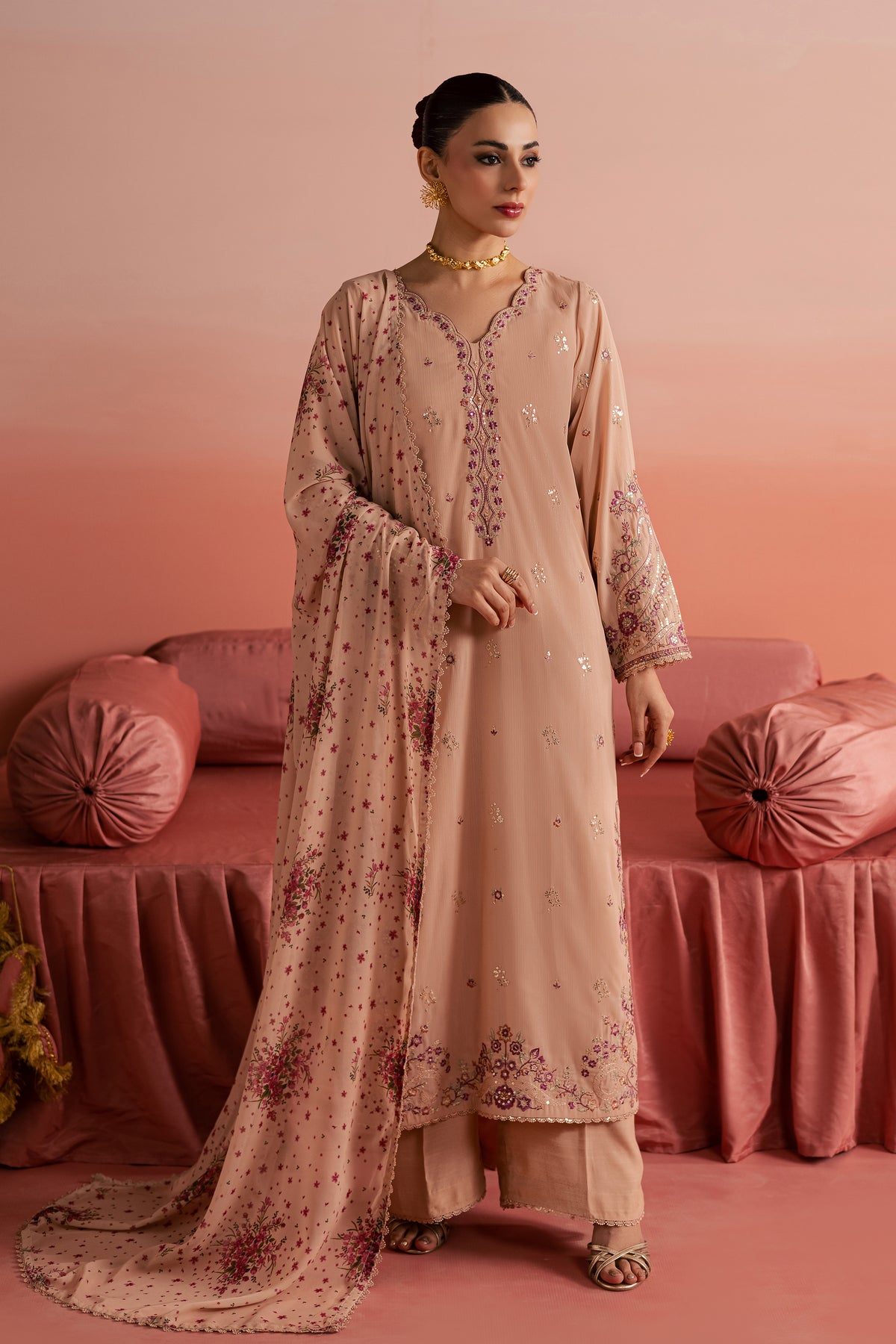 A printed chiffon dupatta completes the look, finished with lace on all four sides, adding softness and contrast to the ensemble.