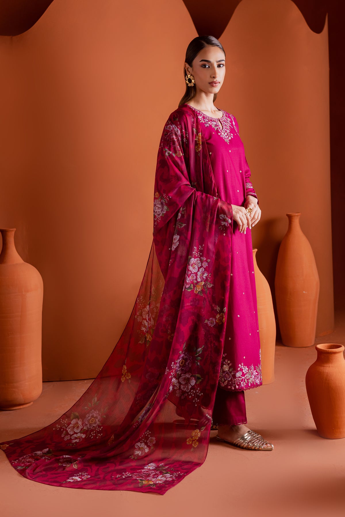 Discover understated elegance with the Inizio three-piece set, featuring a long rasberry pink embroidered khaddar shirt with a graceful rounded hem. The shirt showcases intricate embroidery along the neckline and sides, highlighted by a keyhole embroidered neckline adorned with a delicate front sequin spread. Fitted sleeves are finished with embroidered hems and self crochet lace, adding a refined touch.