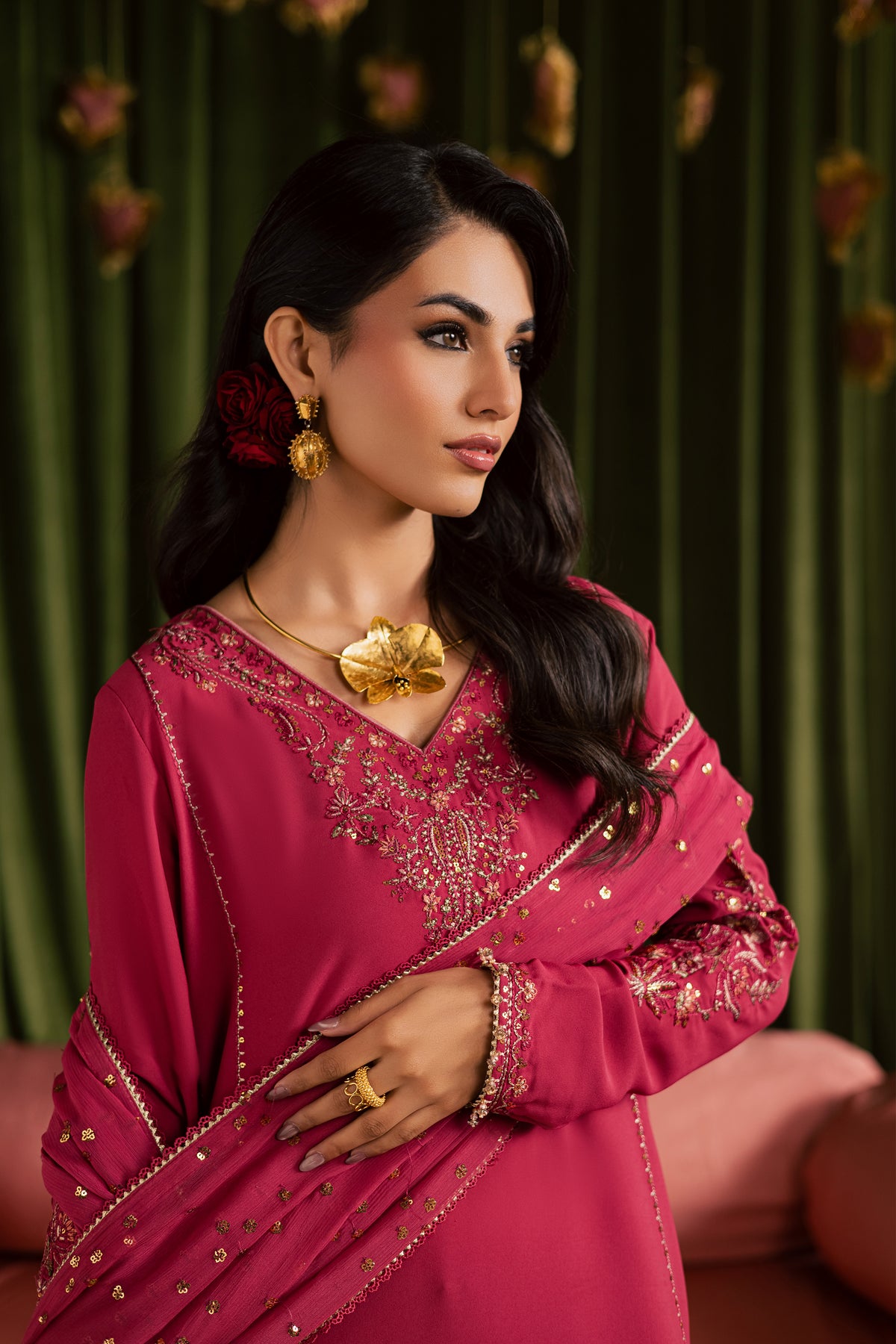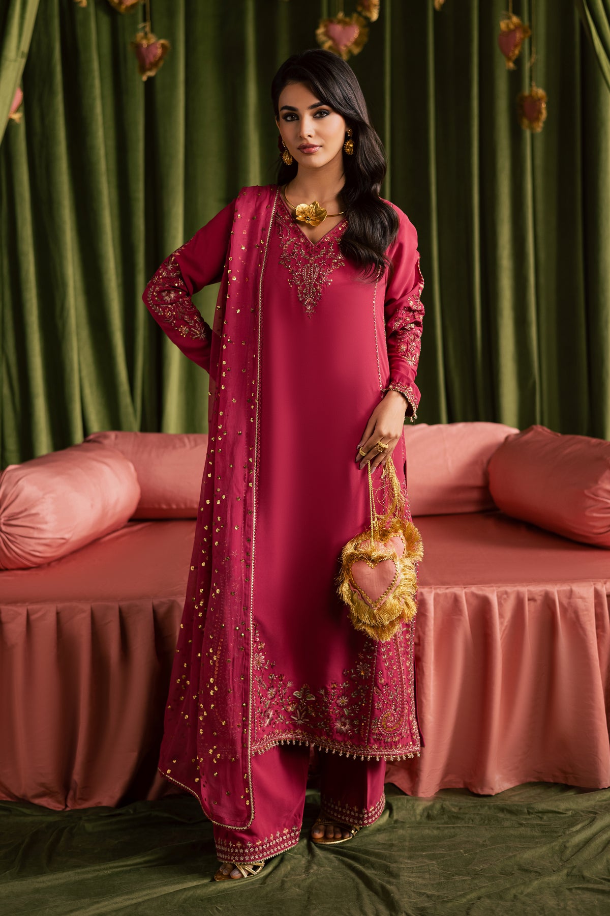 A crinkle dupatta completes the look, designed with an all-over sequin spread that adds soft shimmer for Eid celebrations.