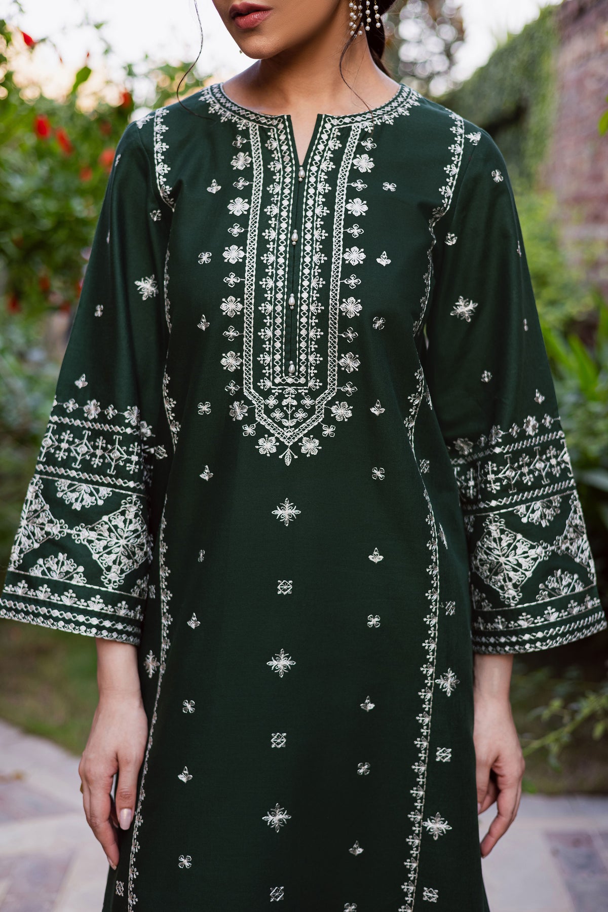 Paired with a regular green karandi shalwar featuring an embroidered border at the hem, the ensemble achieves a graceful balance between structure and flow.