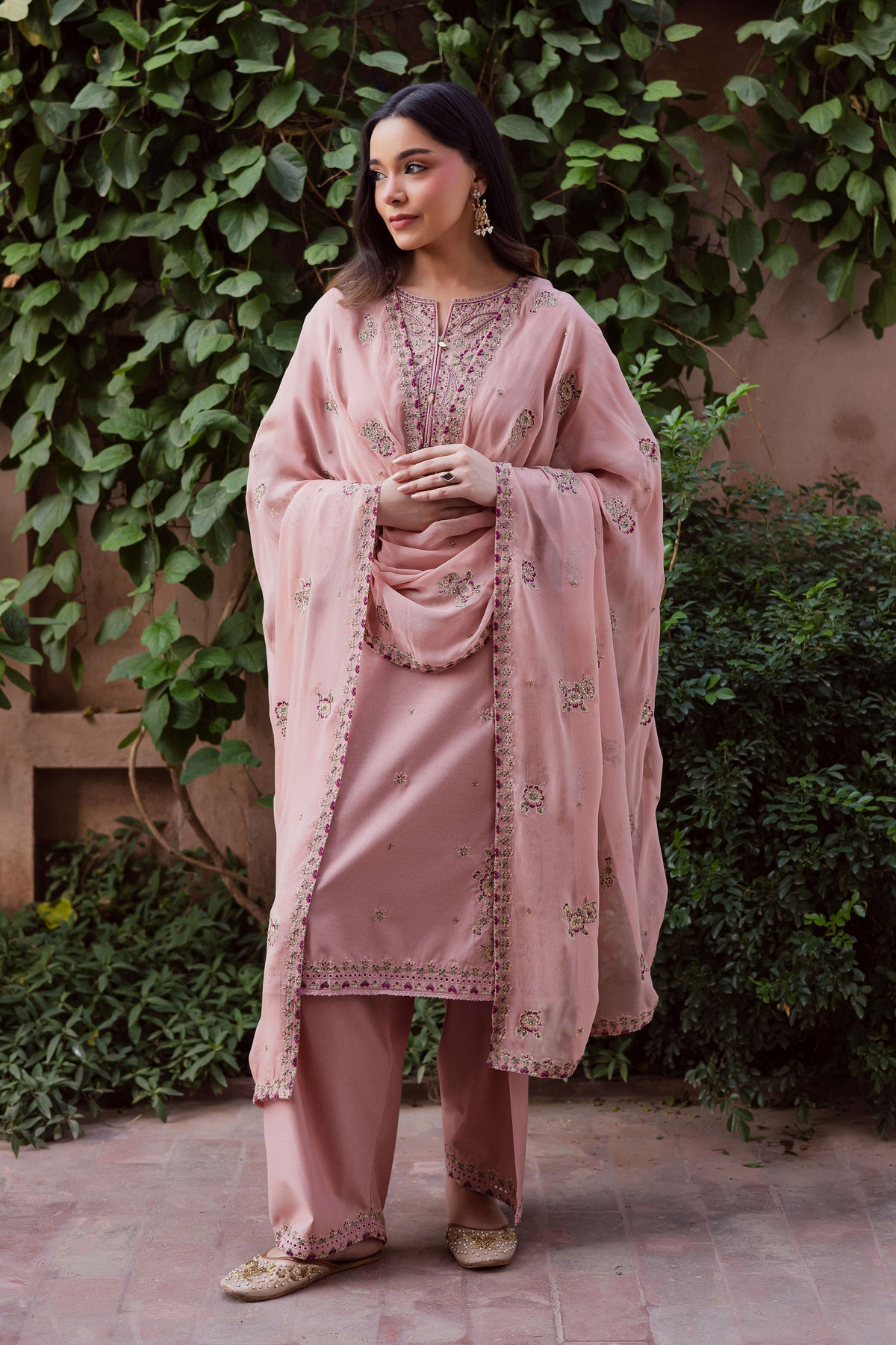 This three piece dress showcases a heavily embroidered karandi shirt adorned with a composed neckline and intricate embroidery along the side panels. The sleeves feature composed heavy embroidery, adding depth and richness to the design. Each finish is beautifully completed with detailed borders, giving the outfit a refined and polished look that embodies timeless elegance.