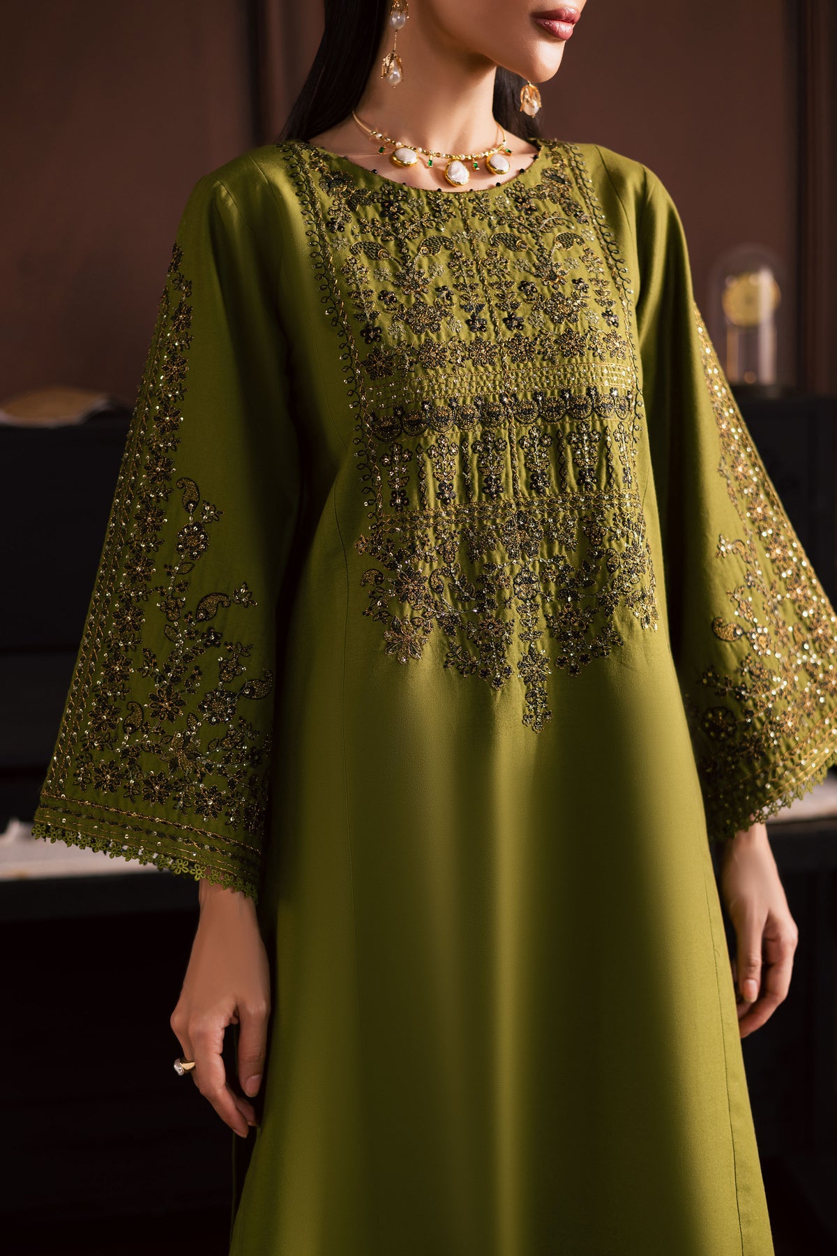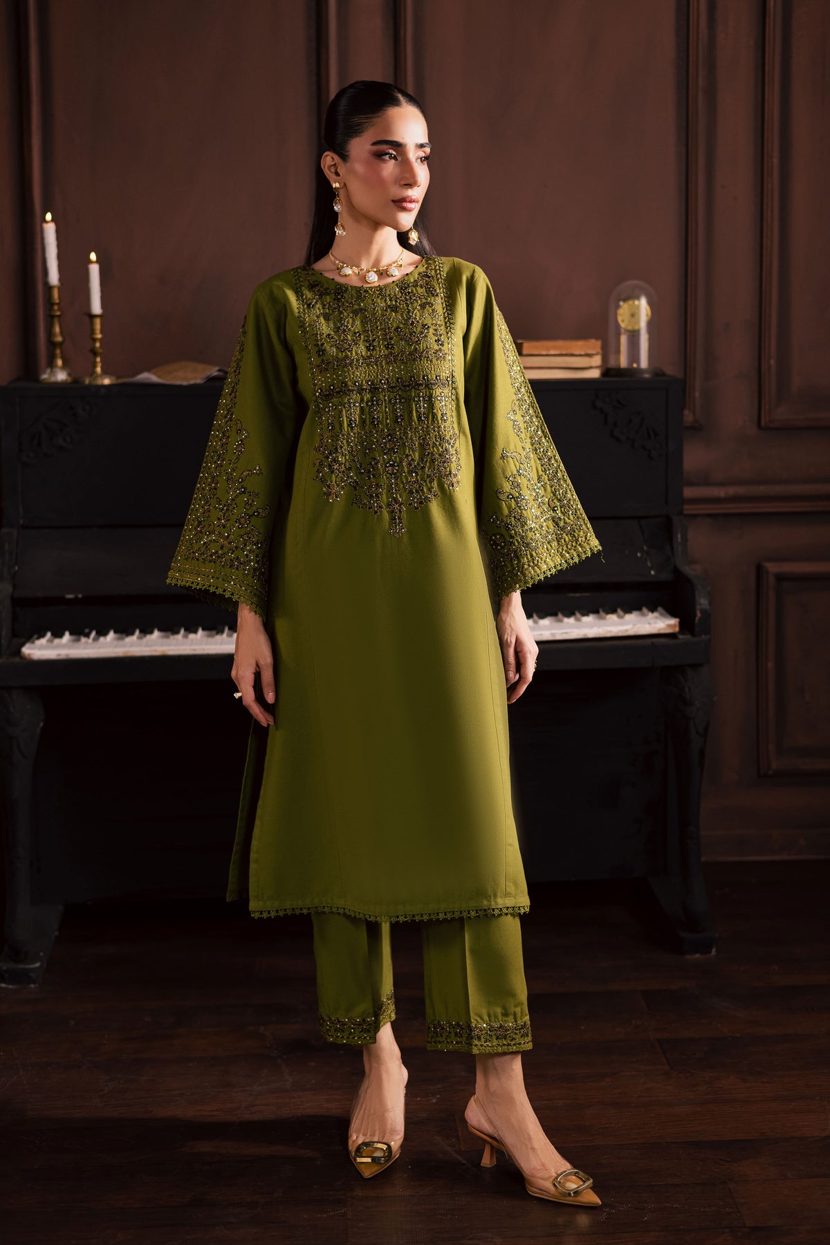 Refresh your winter style with this fern green khaddar two piece, designed to bring elegance and comfort together. The paneled shirt features a heavy embroidered neckline and sleeves, adding richness and depth to its overall look, while the lace finishing gives it a refined and delicate touch.