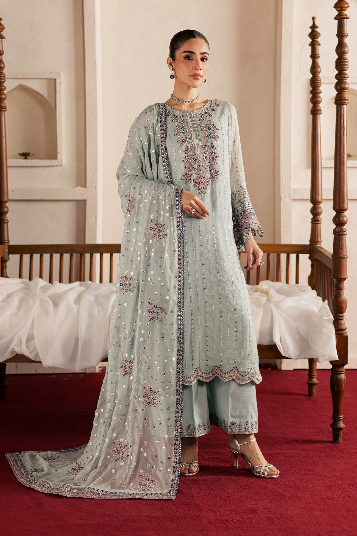 A crinkle dupatta with organza borders completes the ensemble, adding soft movement and enhancing the luxurious festive appeal.