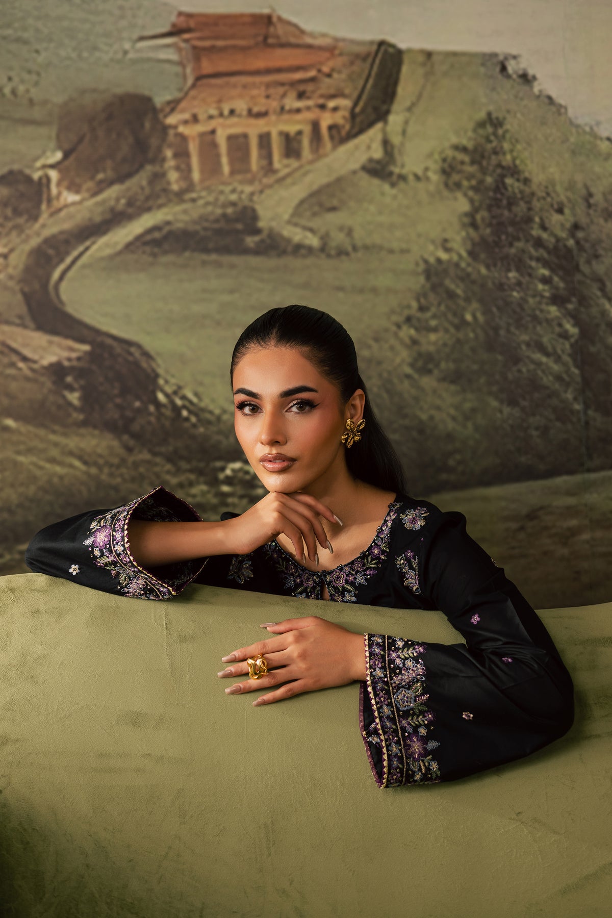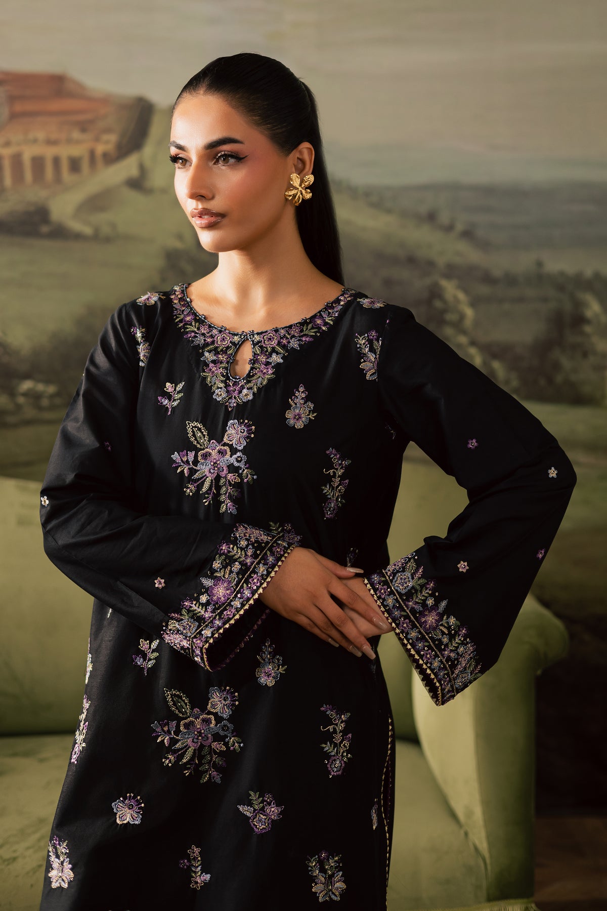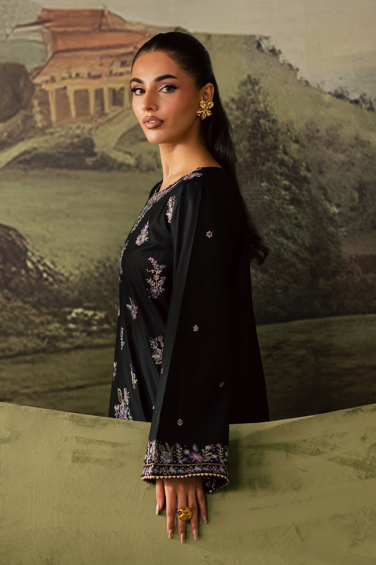 A fully embroidered black pima lawn short shirt designed with a round hem and a minimal neckline featuring a subtle keyhole detail. The shirt is finished with samosa lace and contrast piping, adding a refined touch and a hint of playful contrast to the elegant embroidery.