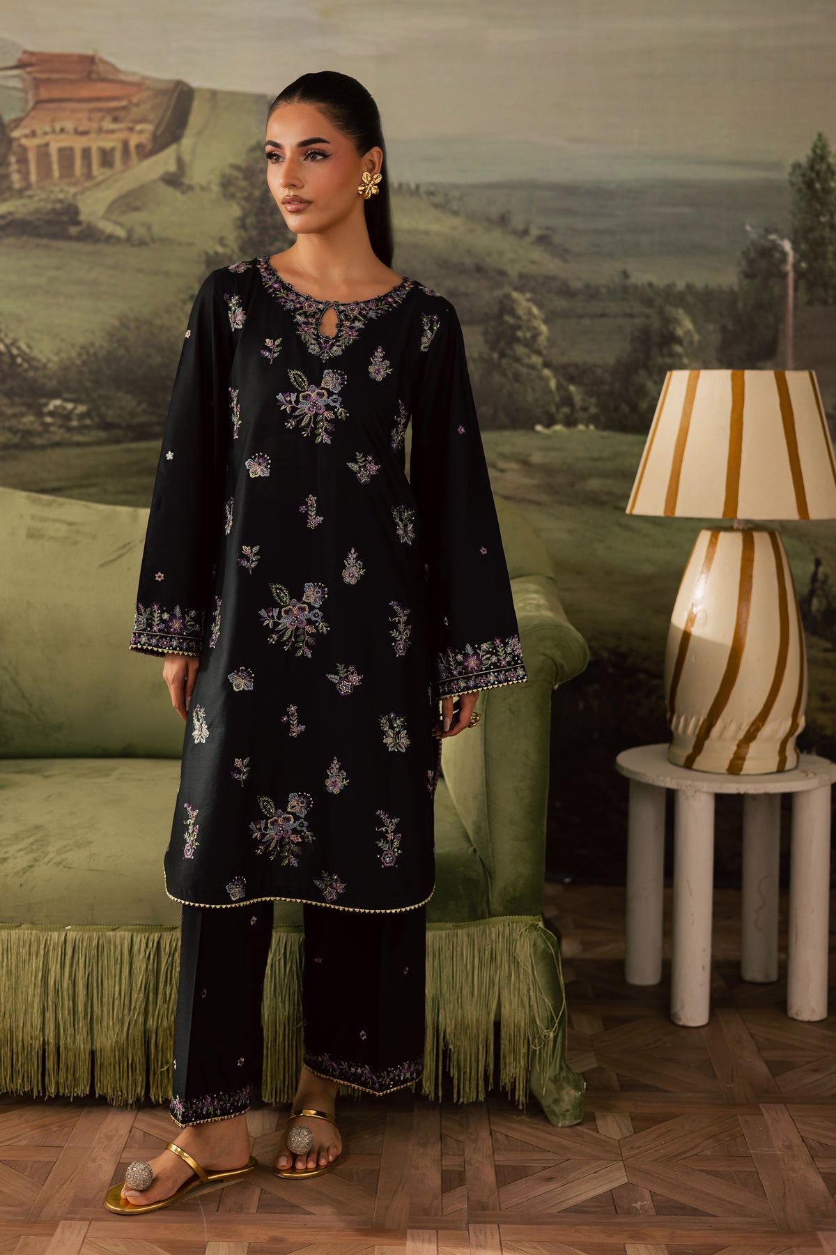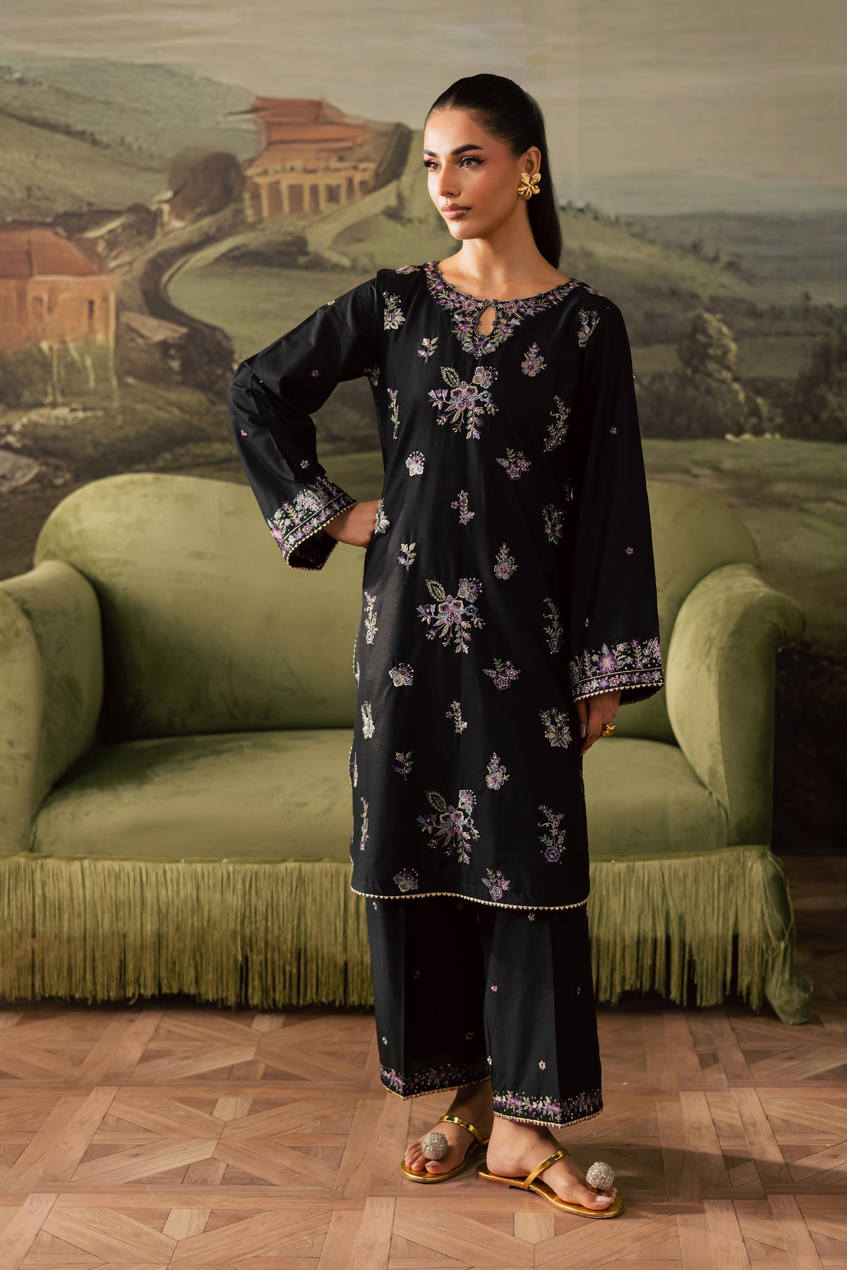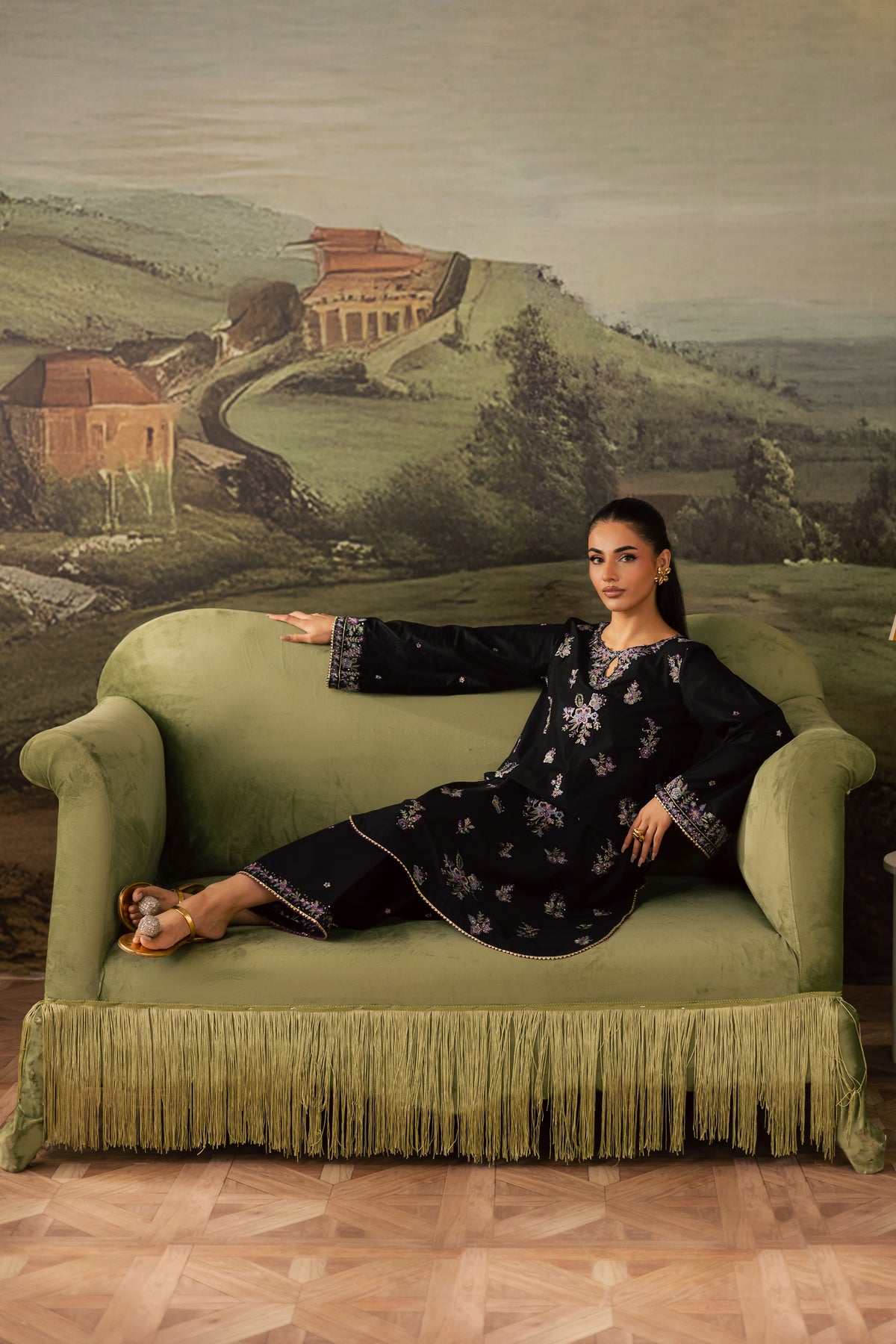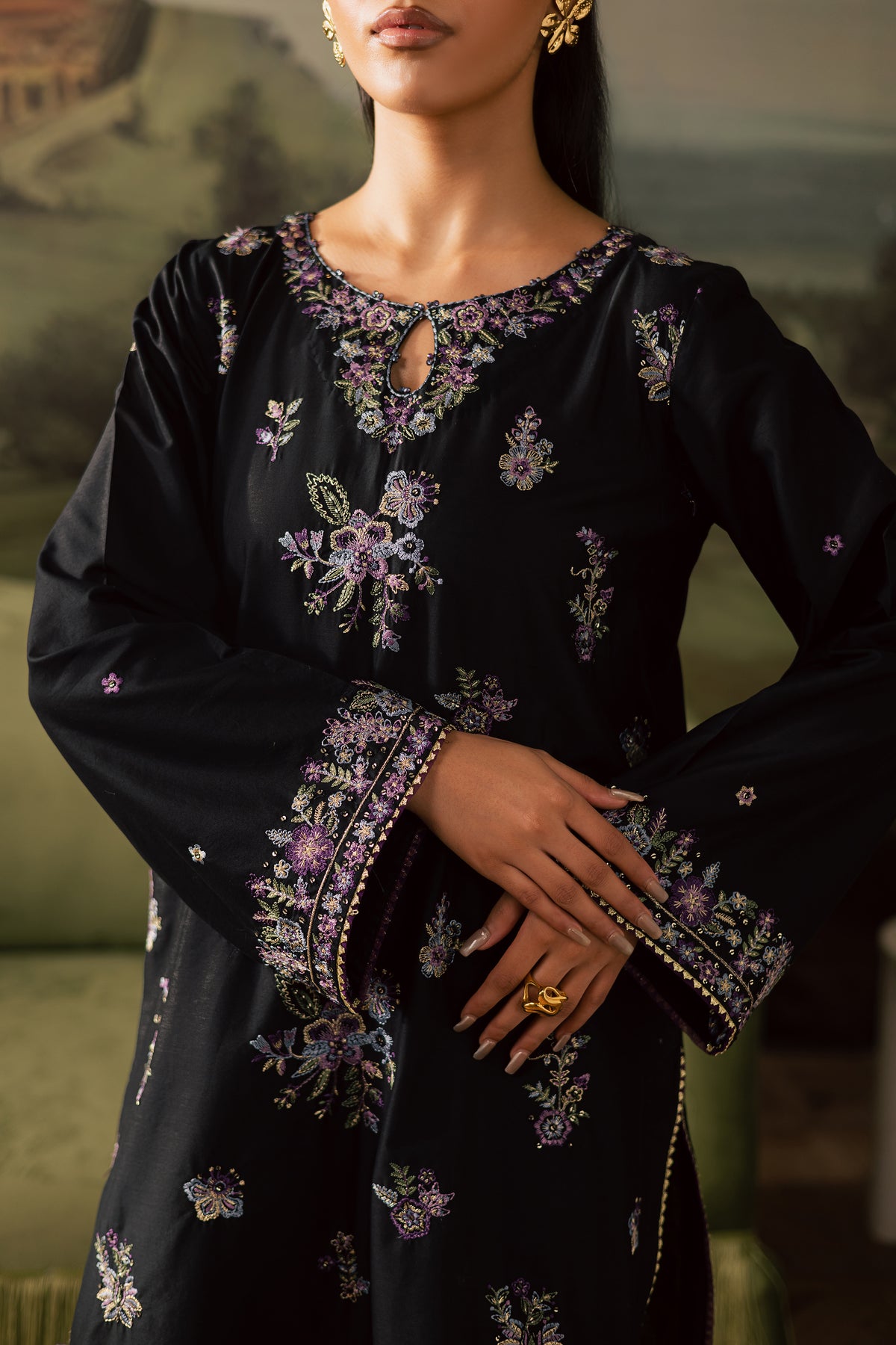 A fully embroidered black pima lawn short shirt designed with a round hem and a minimal neckline featuring a subtle keyhole detail. The shirt is finished with samosa lace and contrast piping, adding a refined touch and a hint of playful contrast to the elegant embroidery.