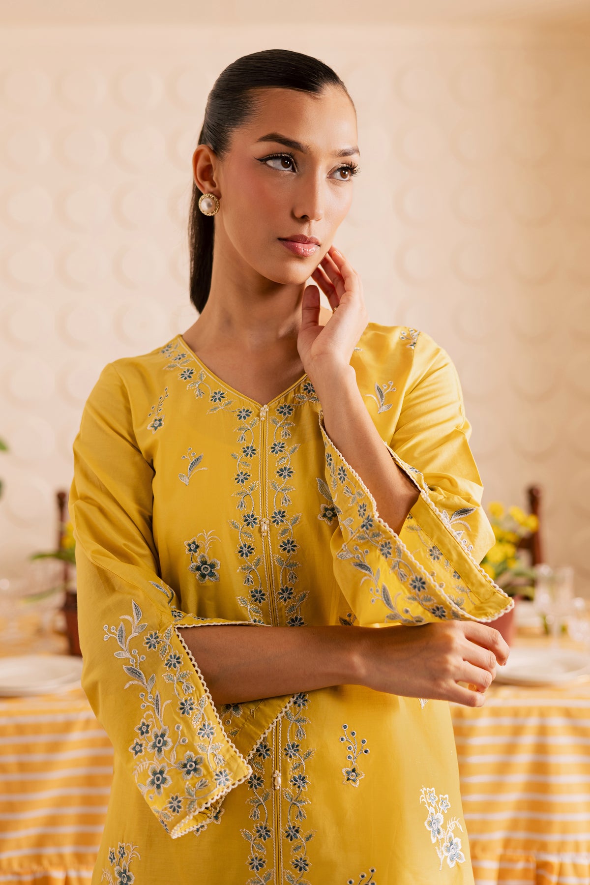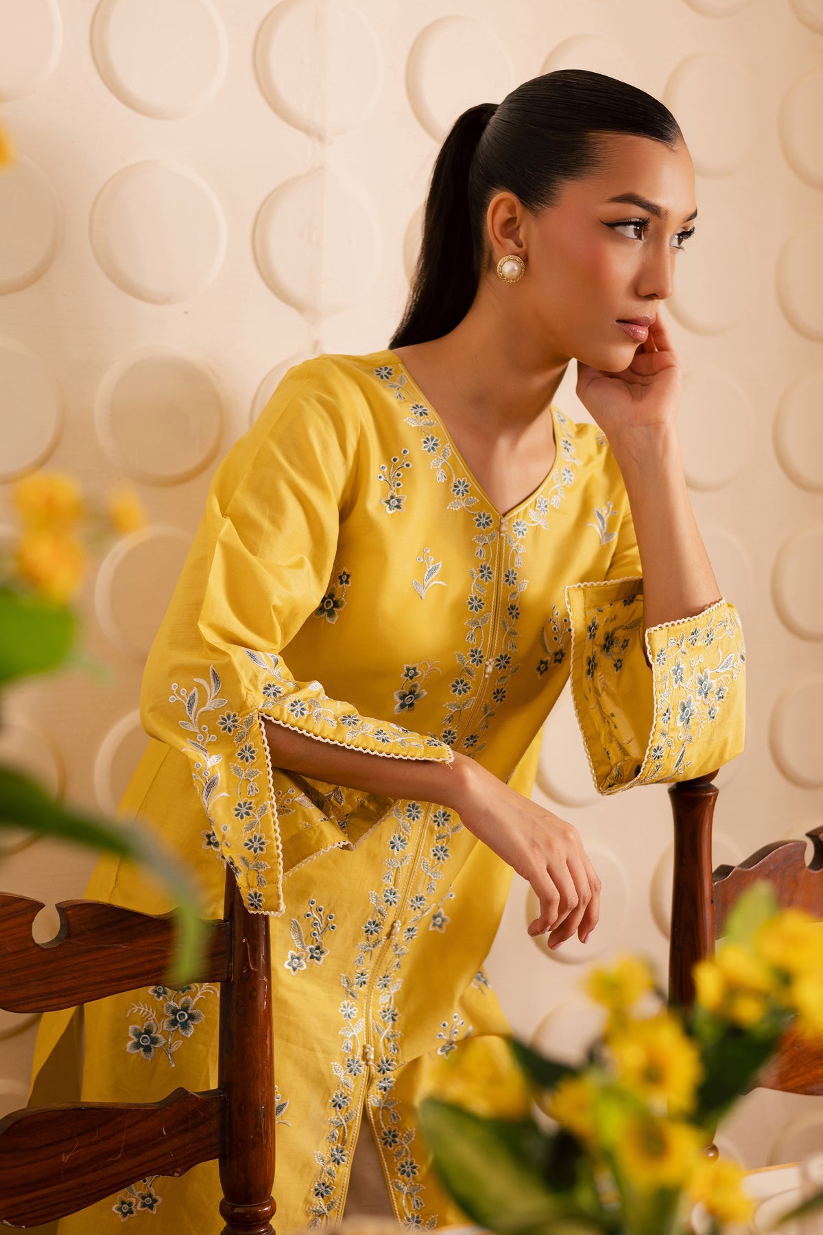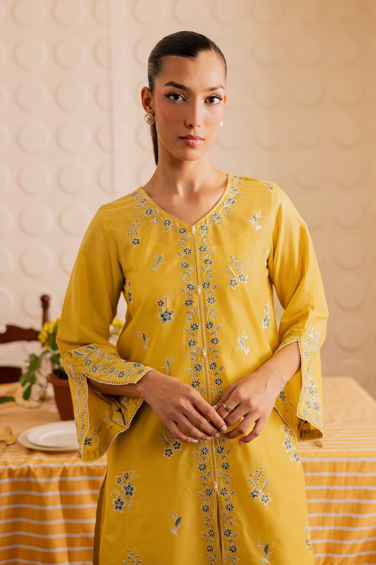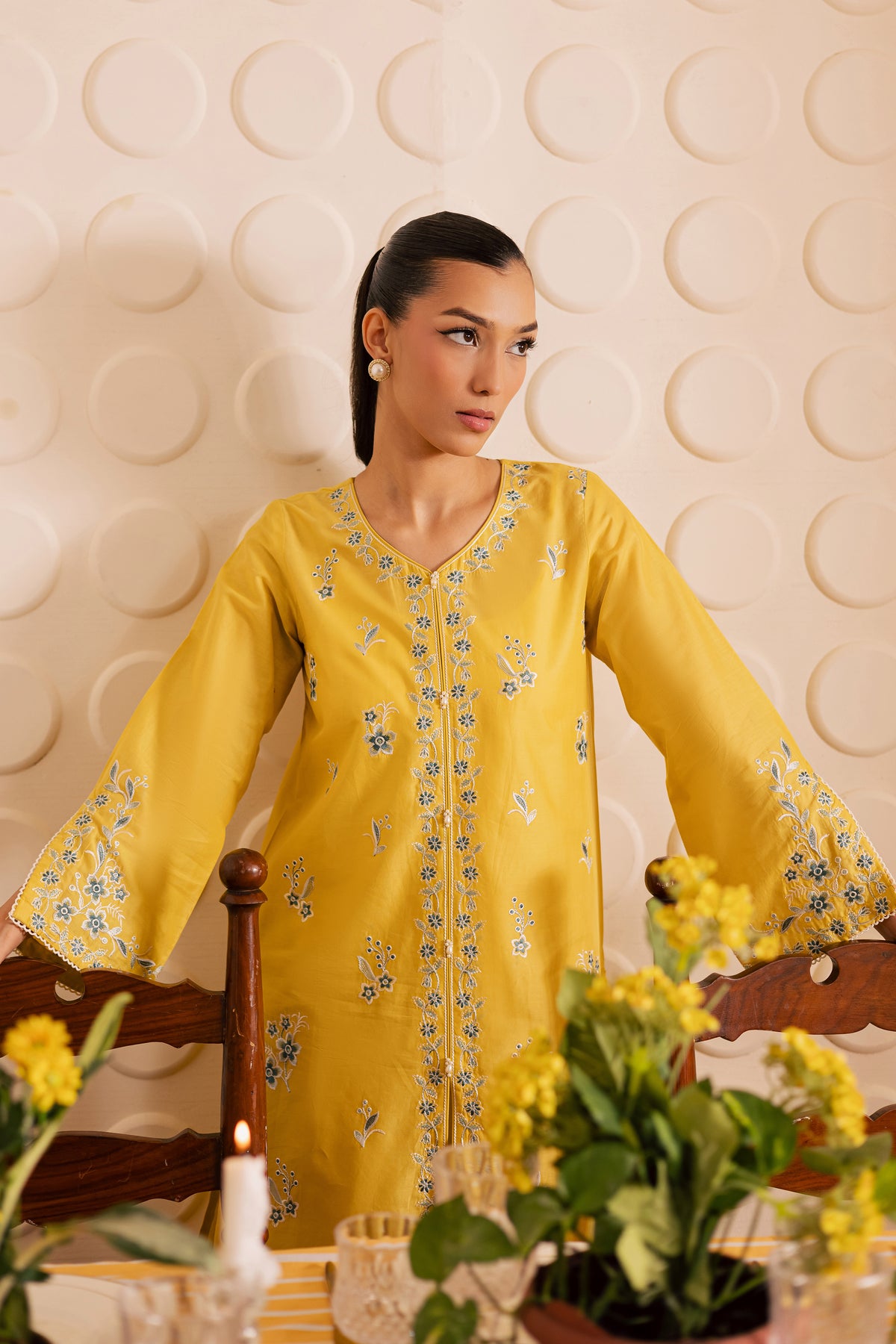 A fully embroidered lemon yellow pima lawn front-open shirt, gracefully finished with lace detailing and complemented by embroidered sleeves featuring subtle side slits - striking the perfect balance between tradition and contemporary flair.