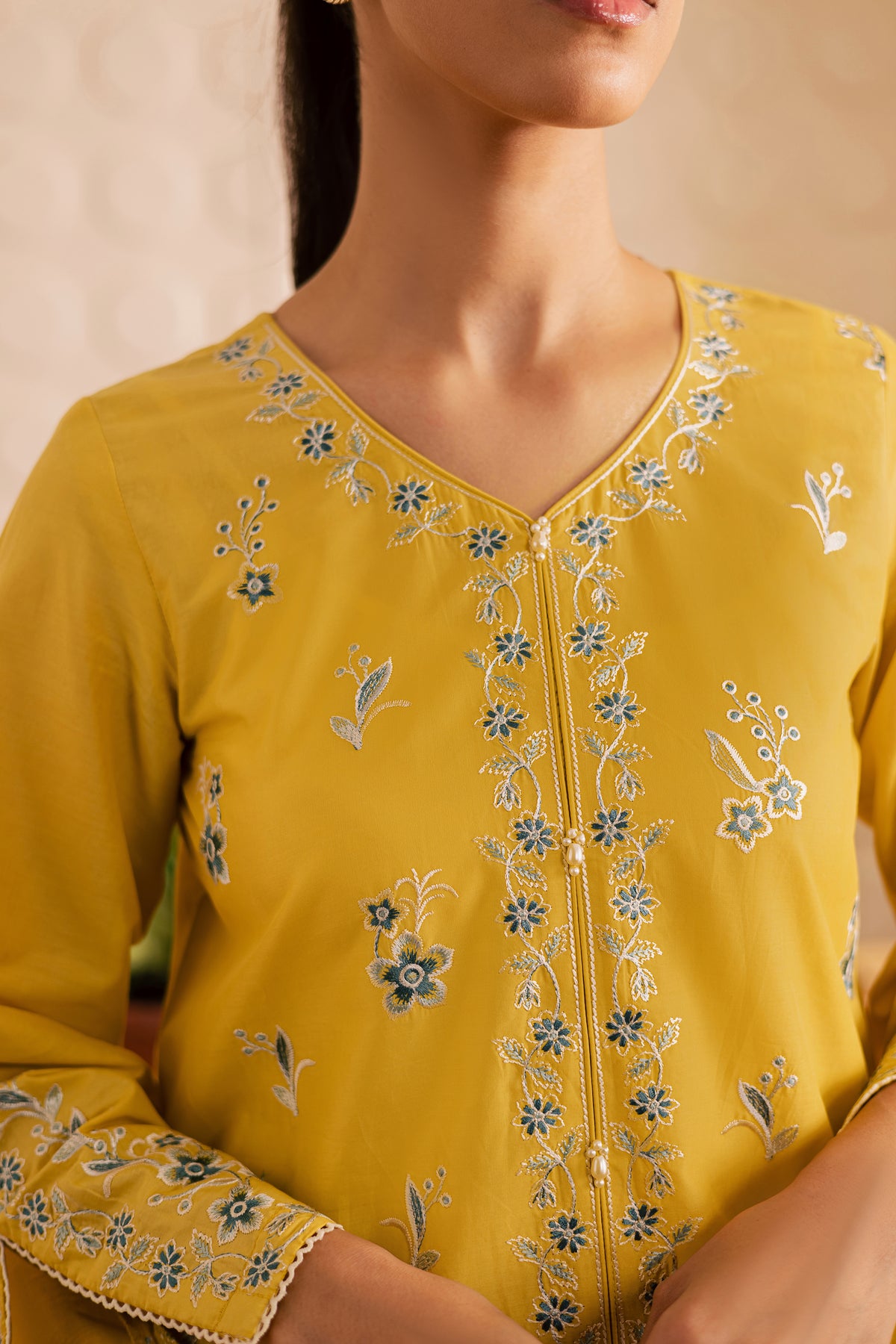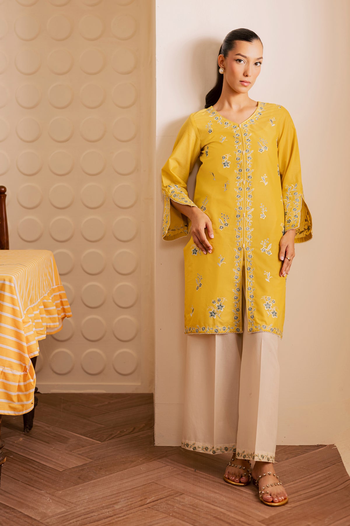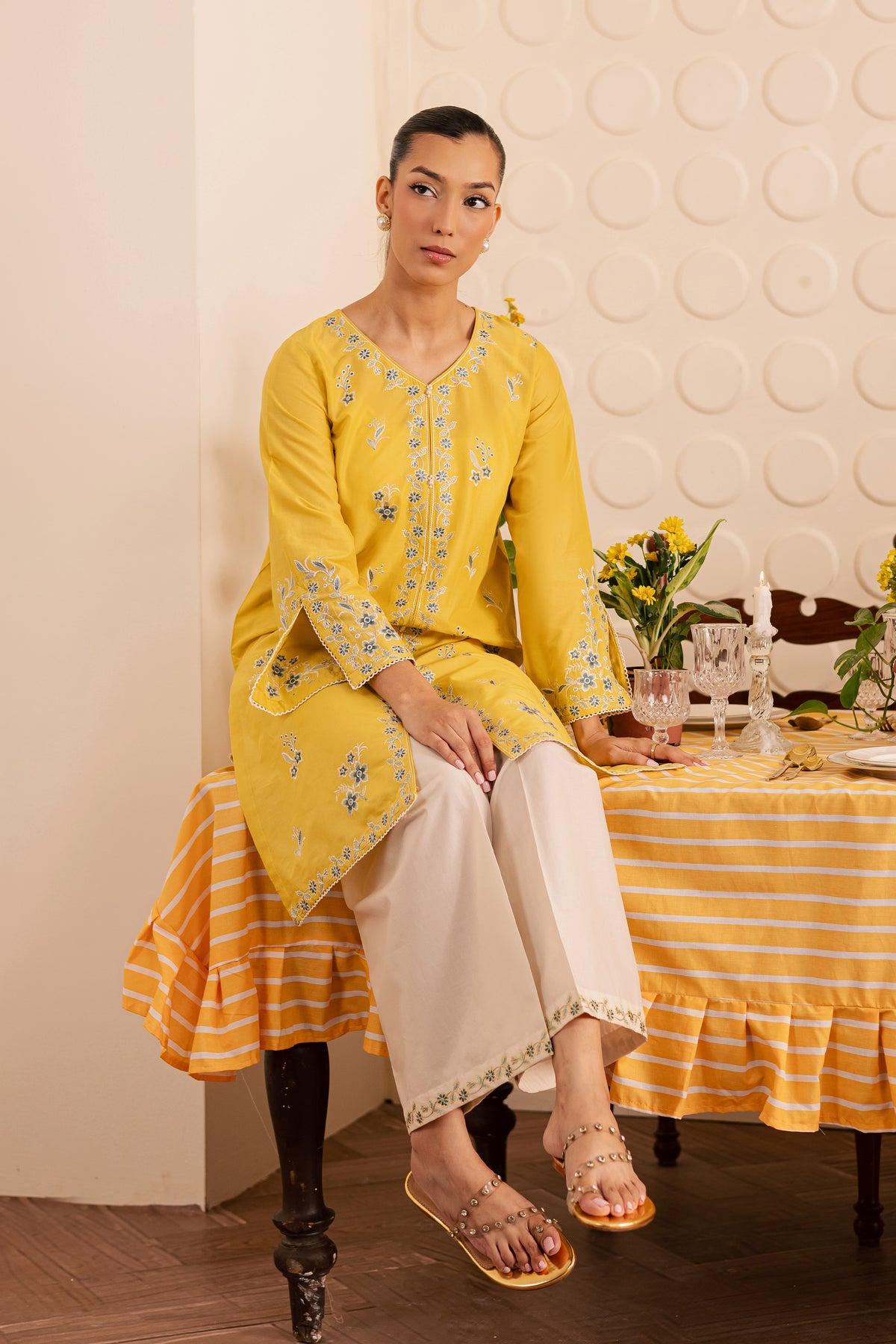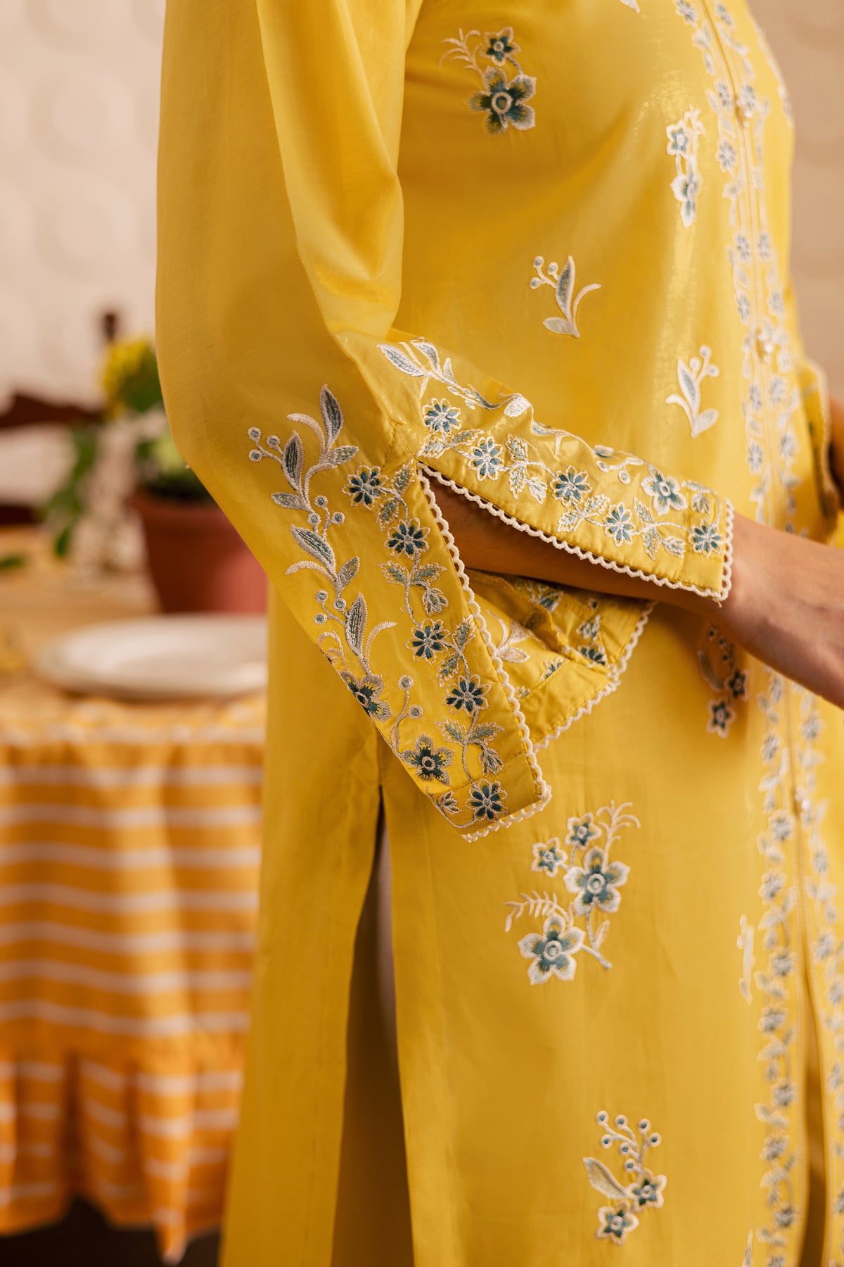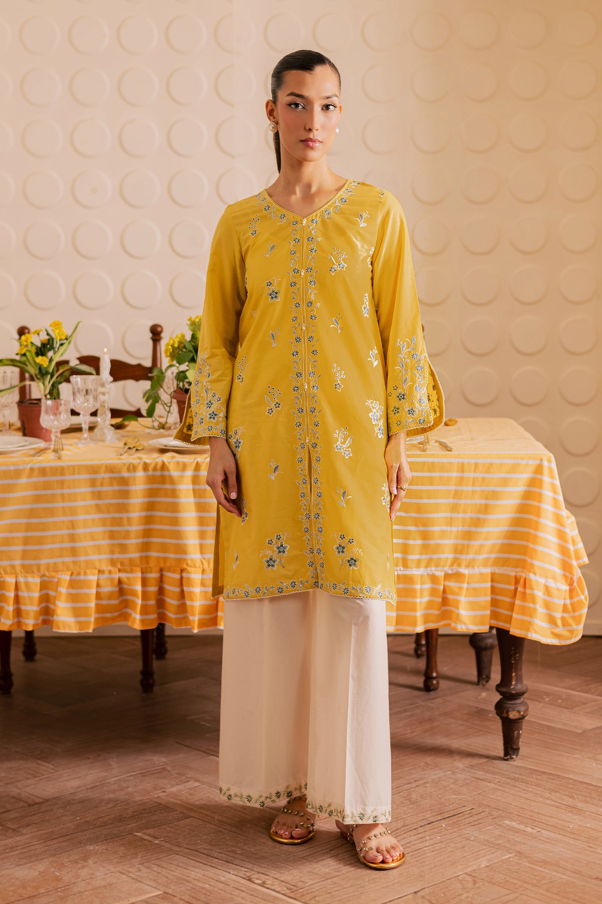A fully embroidered lemon yellow pima lawn front-open shirt, gracefully finished with lace detailing and complemented by embroidered sleeves featuring subtle side slits - striking the perfect balance between tradition and contemporary flair.