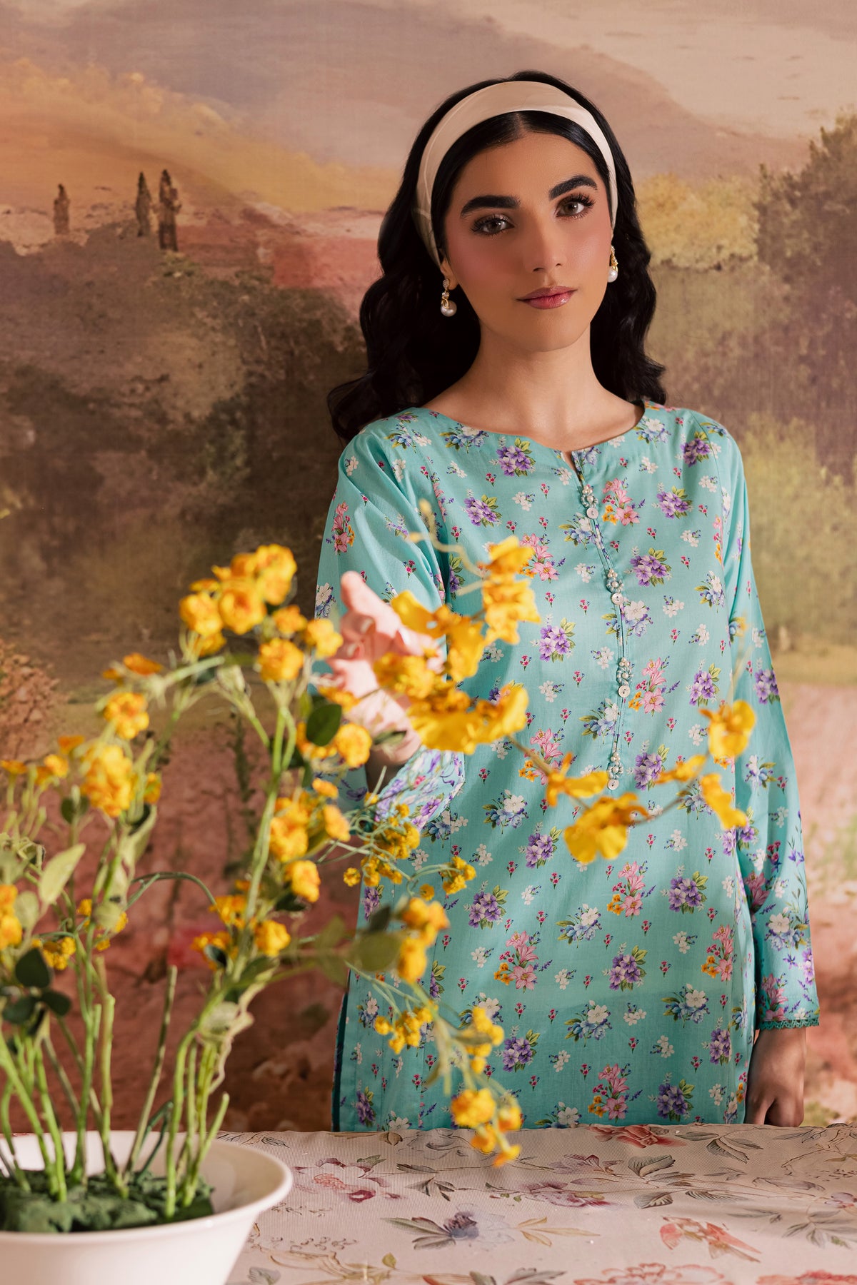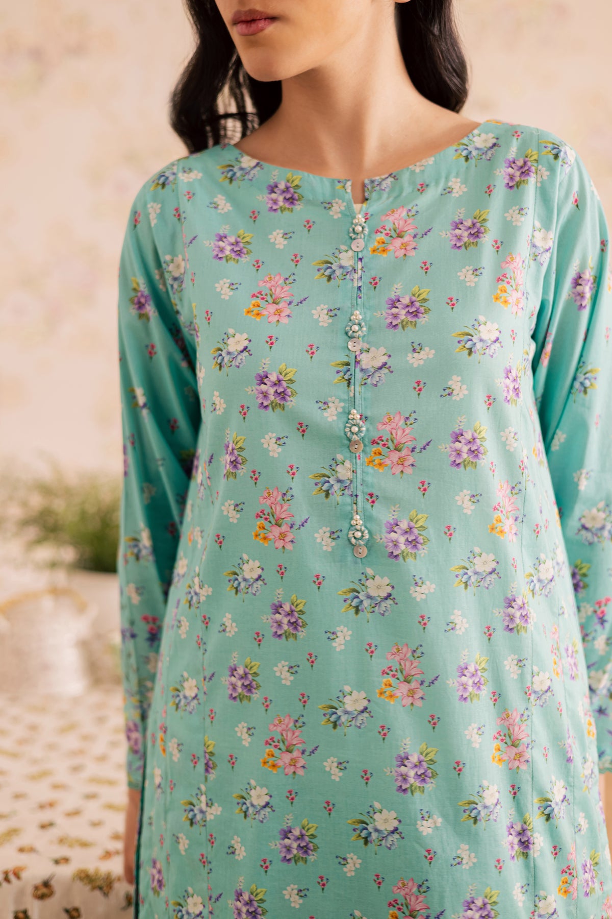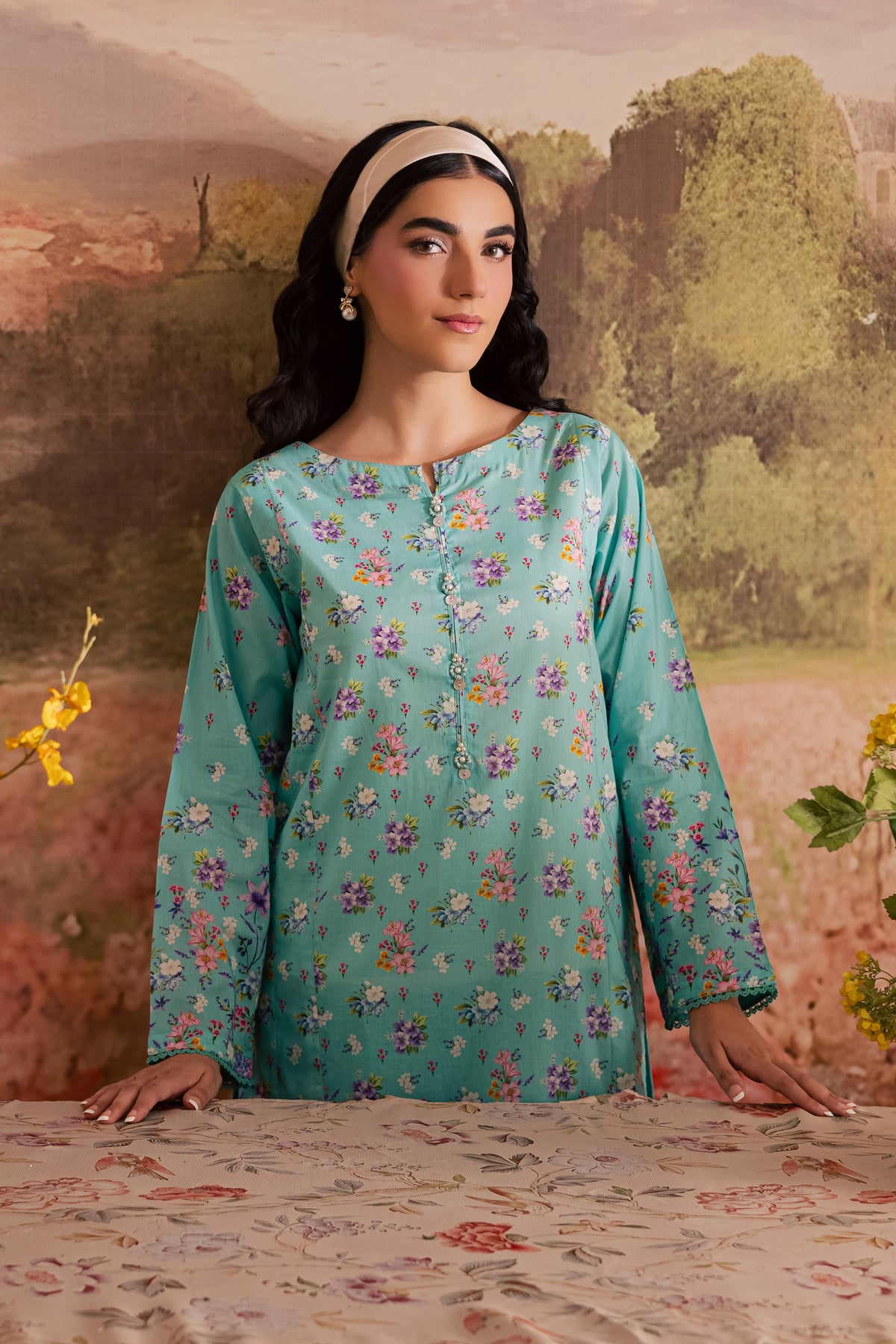 A beautifully printed blue lawn long shirt forms the highlight of this refined ensemble, featuring an embellished neckline adorned with a delicate pearl and button collage. The intricate accents add a touch of understated glamour, perfectly balancing tradition with contemporary flair.