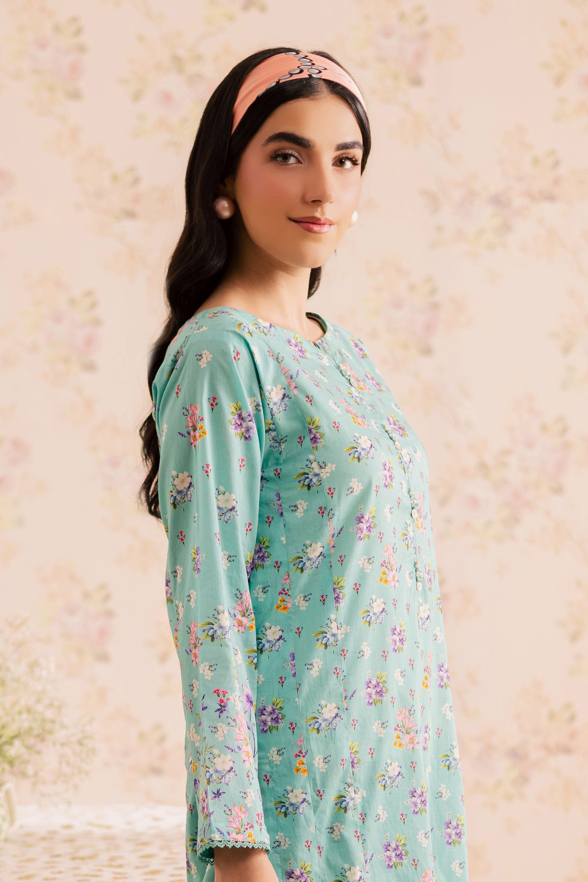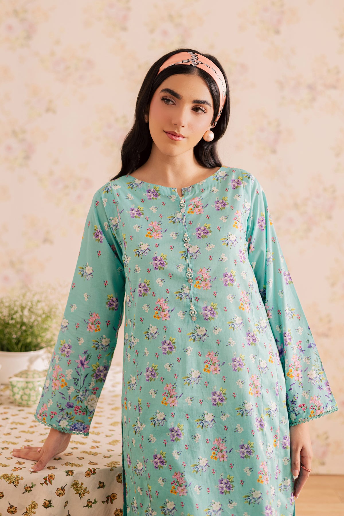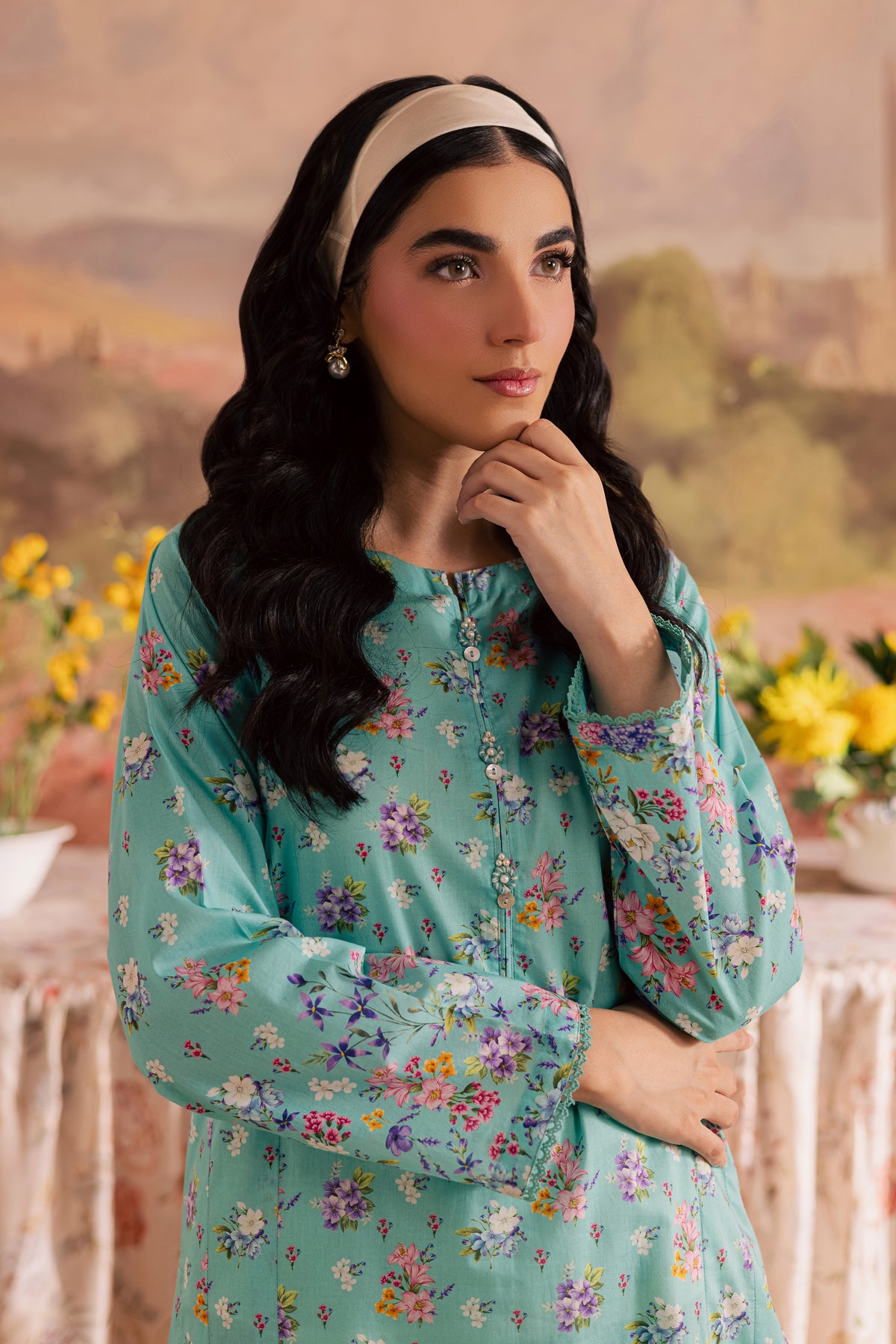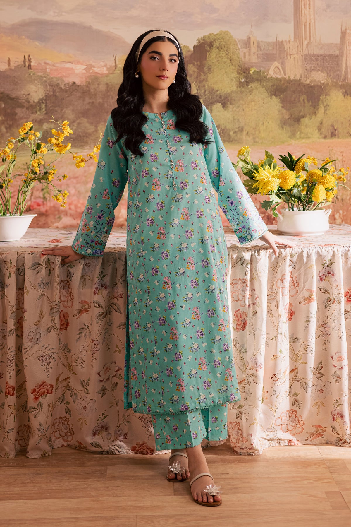 A beautifully printed blue lawn long shirt forms the highlight of this refined ensemble, featuring an embellished neckline adorned with a delicate pearl and button collage. The intricate accents add a touch of understated glamour, perfectly balancing tradition with contemporary flair.