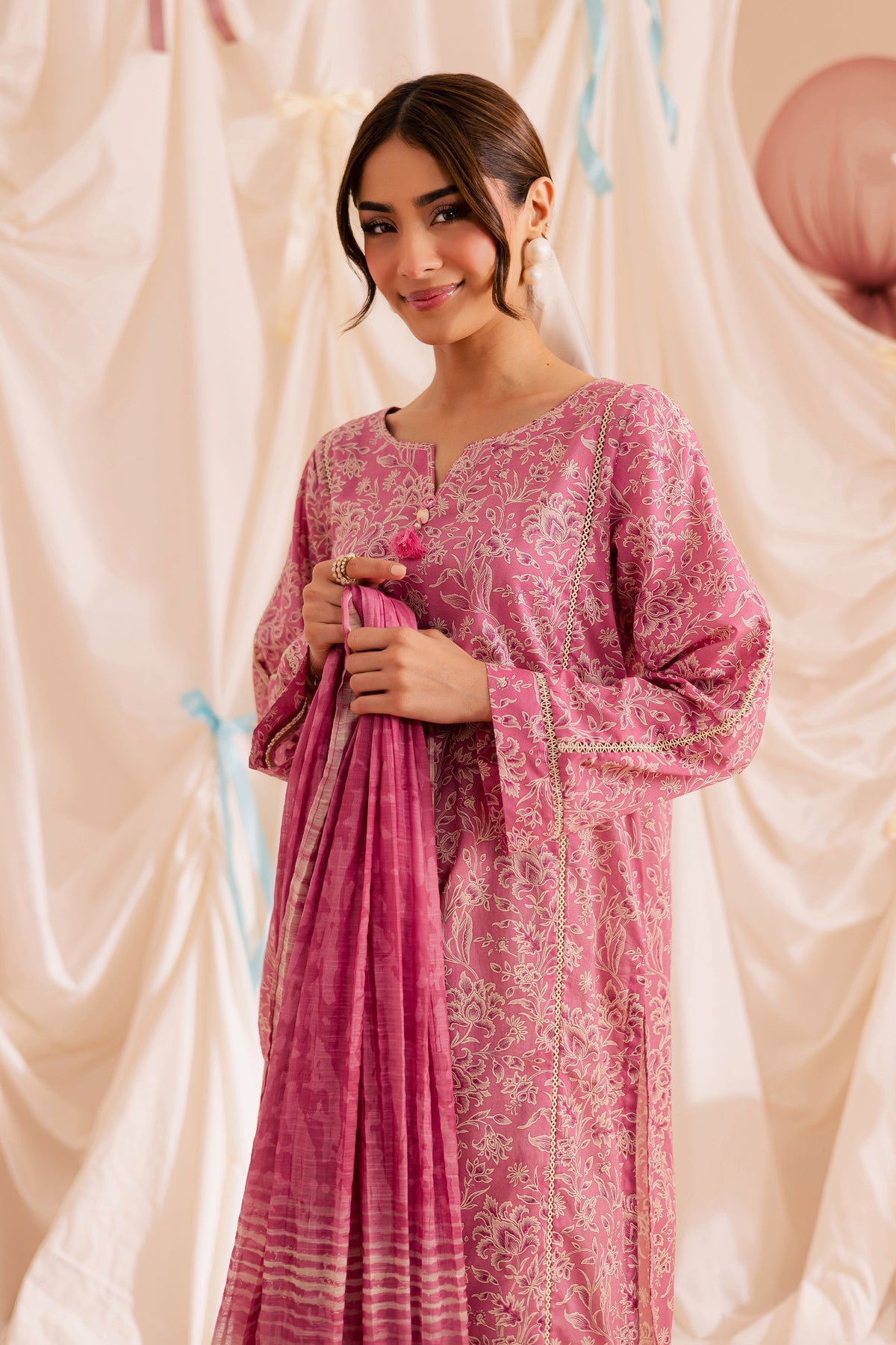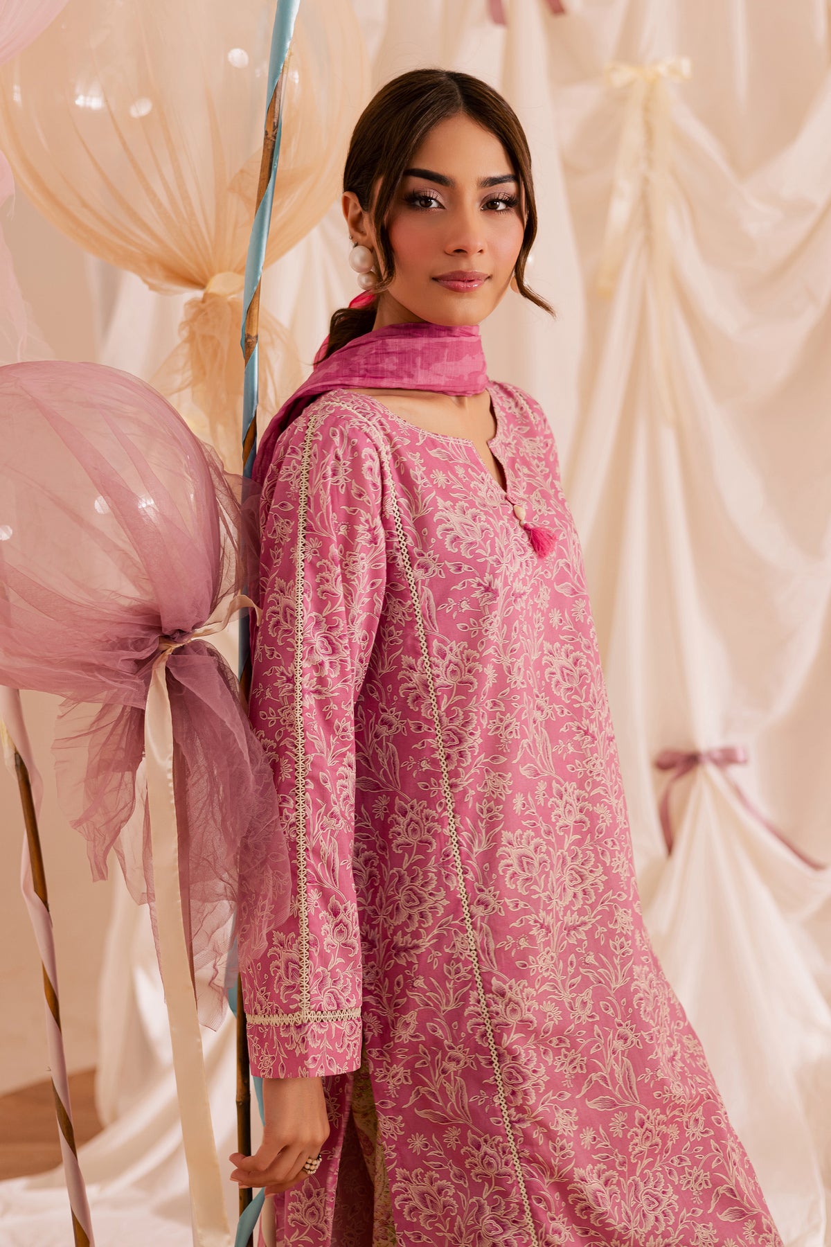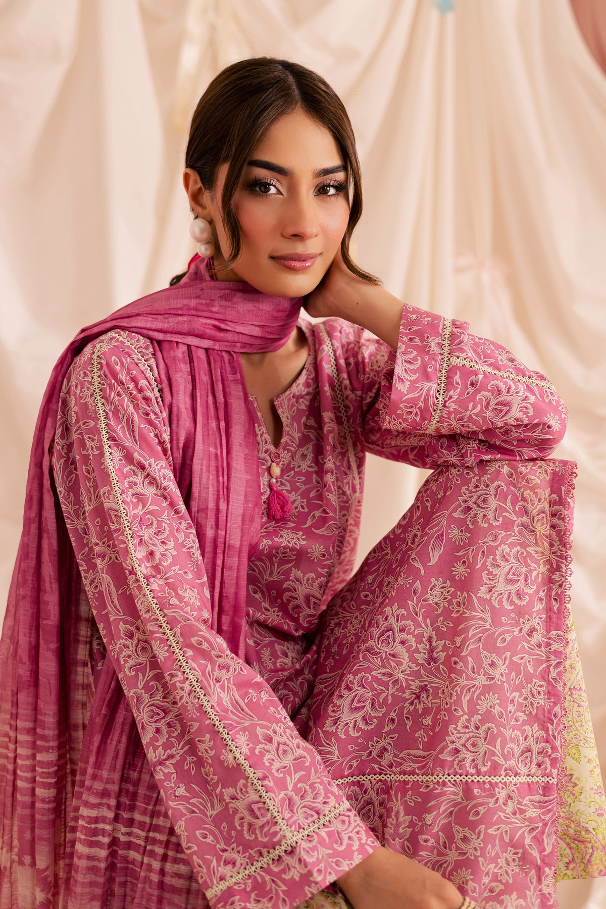 Printed cambric Farshi shalwar gracefully finished with lace along the edges, complementing the shirt with its flowing silhouette and delicate detailing.