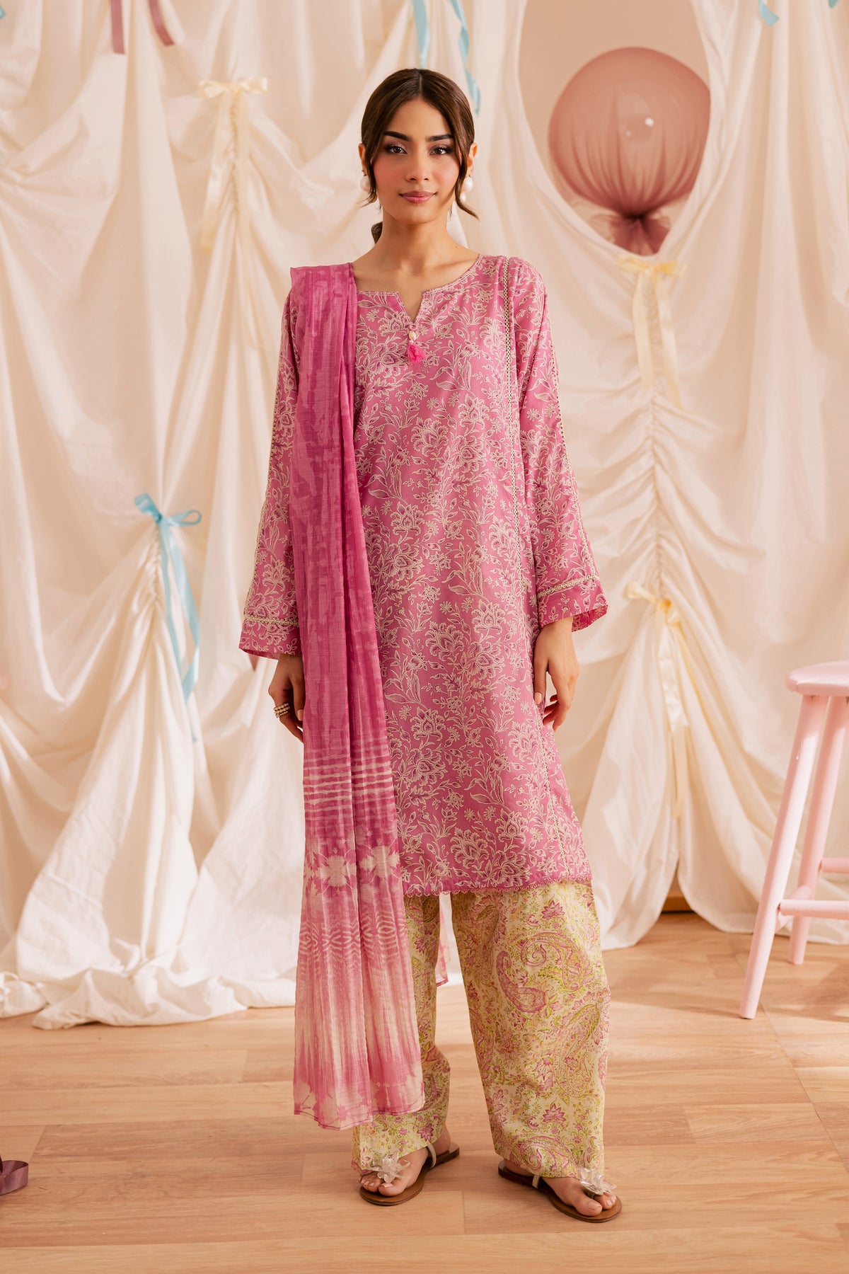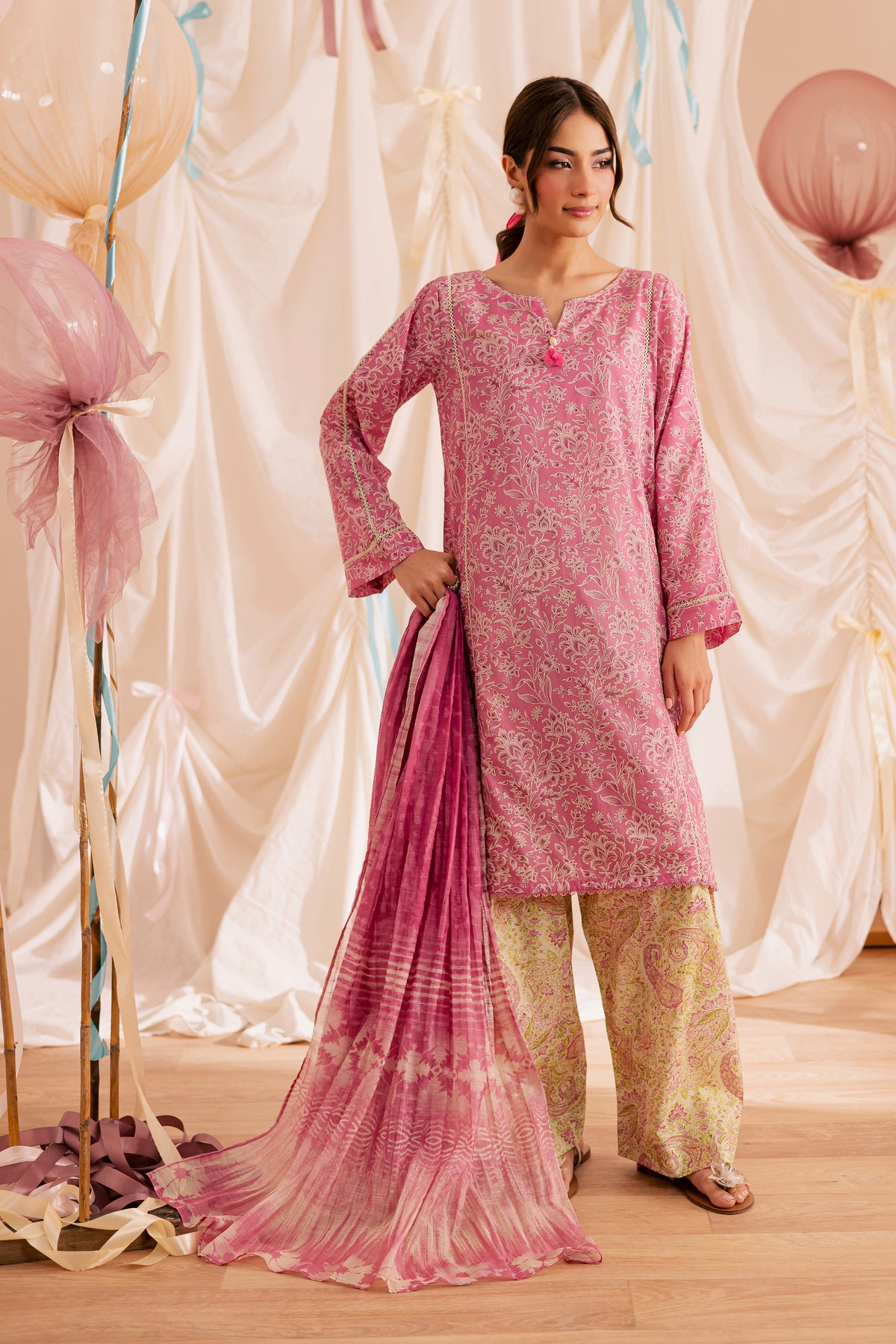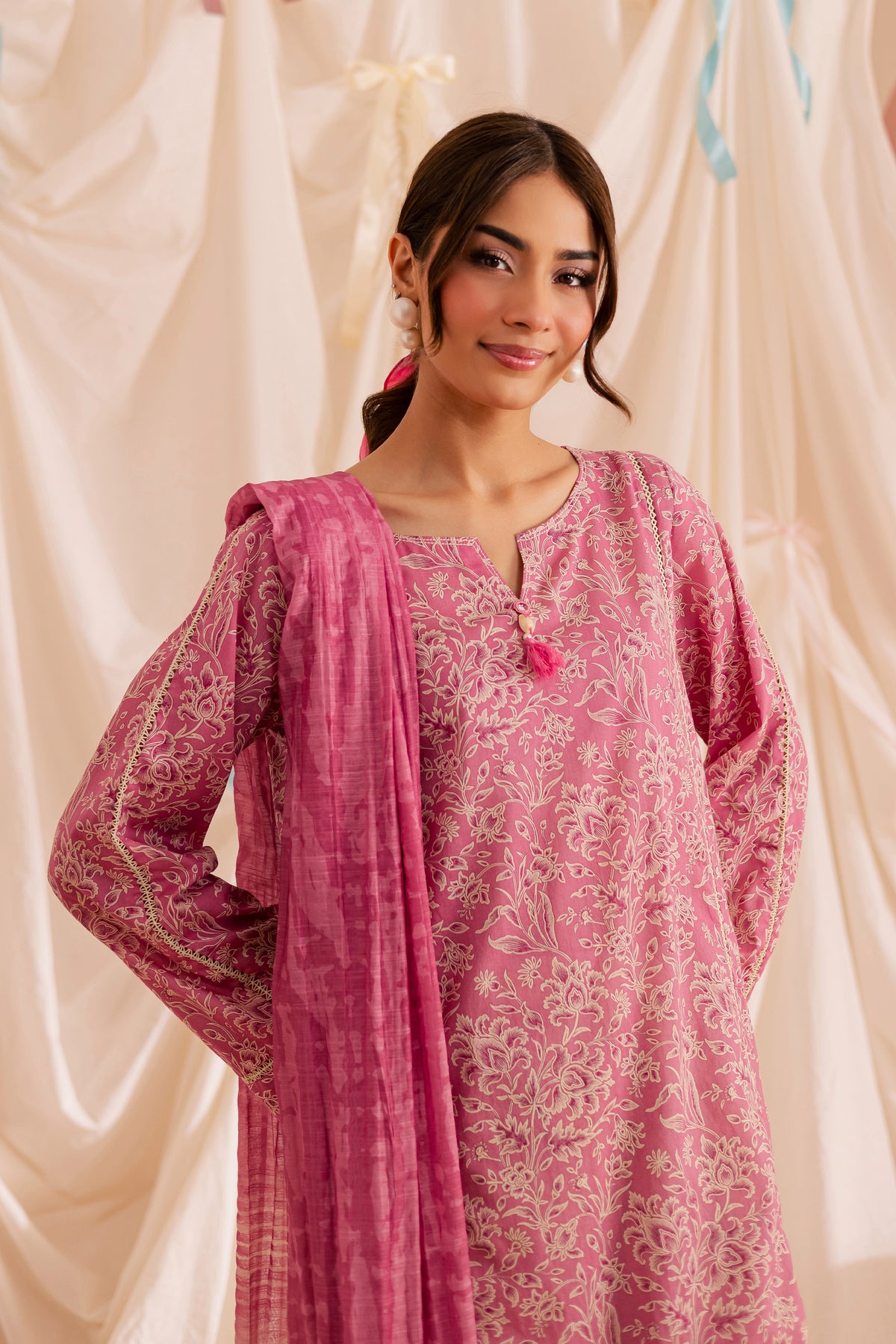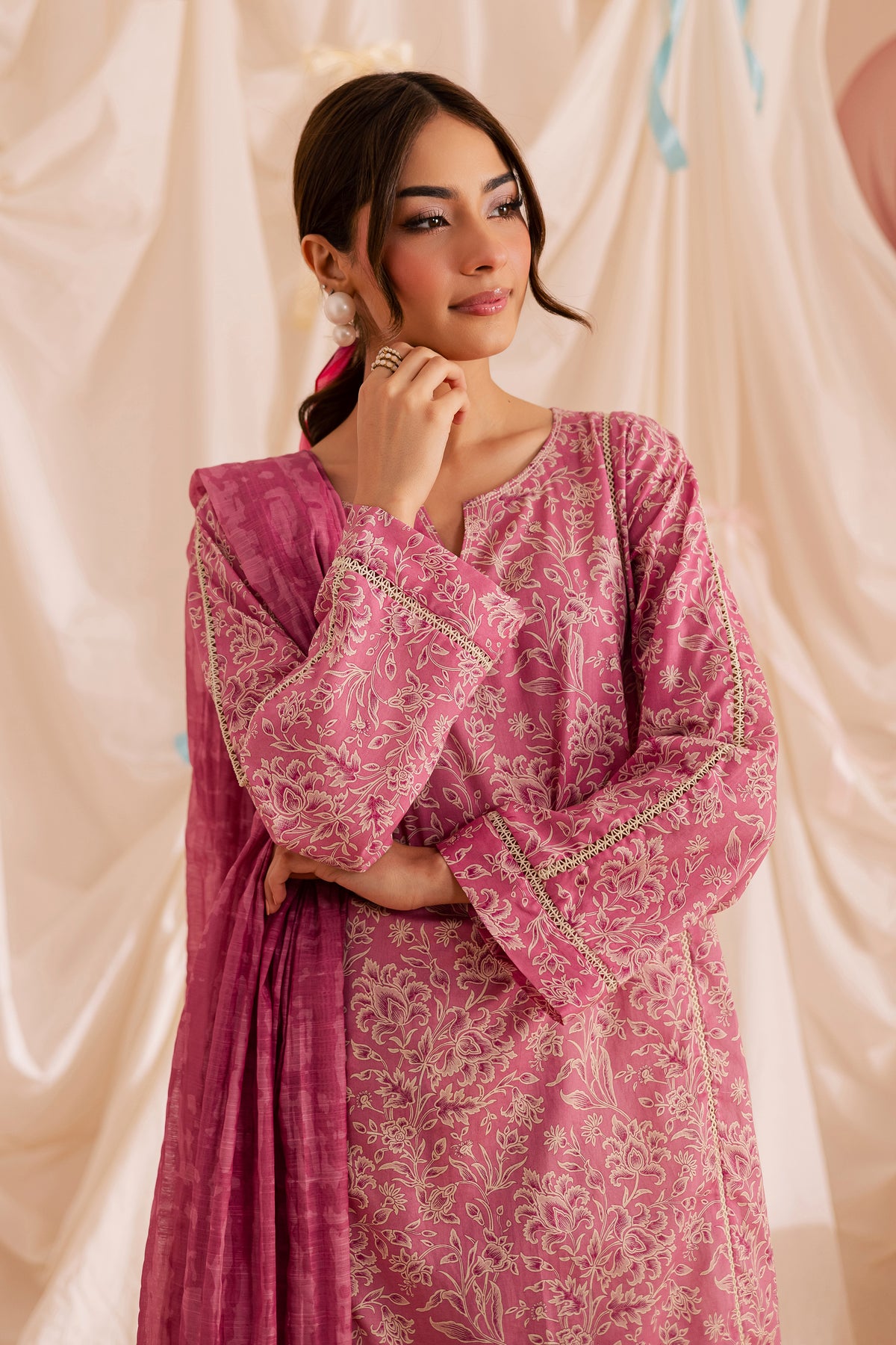 Printed cambric Farshi shalwar gracefully finished with lace along the edges, complementing the shirt with its flowing silhouette and delicate detailing.