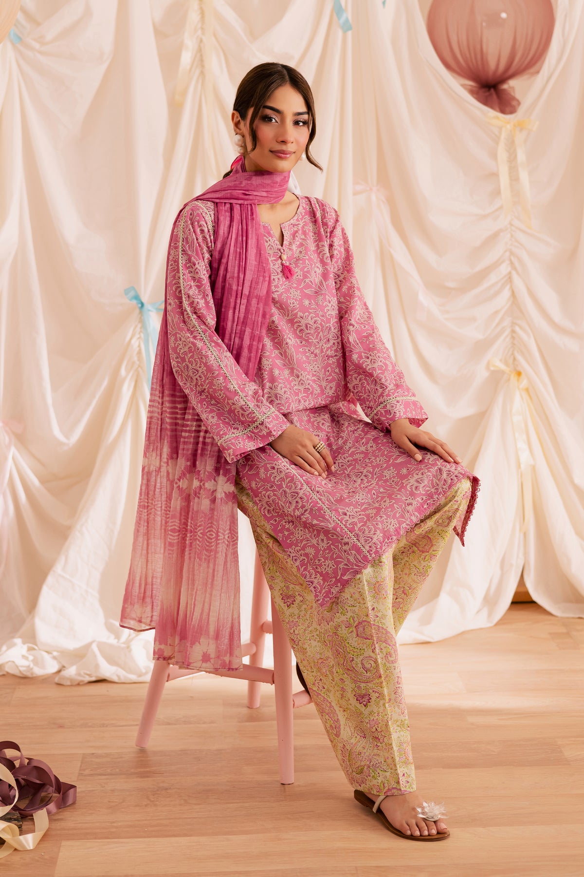 A mid-length panelled pink lawn shirt features delicate off-white seerhi lace intricately woven into the panels, elevating the design with timeless grace. The neckline is adorned with a charming shell and tassel collage, while fabric manipulation on the sleeves, accented with seerhi lace, adds subtle texture and dimension. The shirt hem is beautifully finished with matching lace, completing the sophisticated silhouette.
