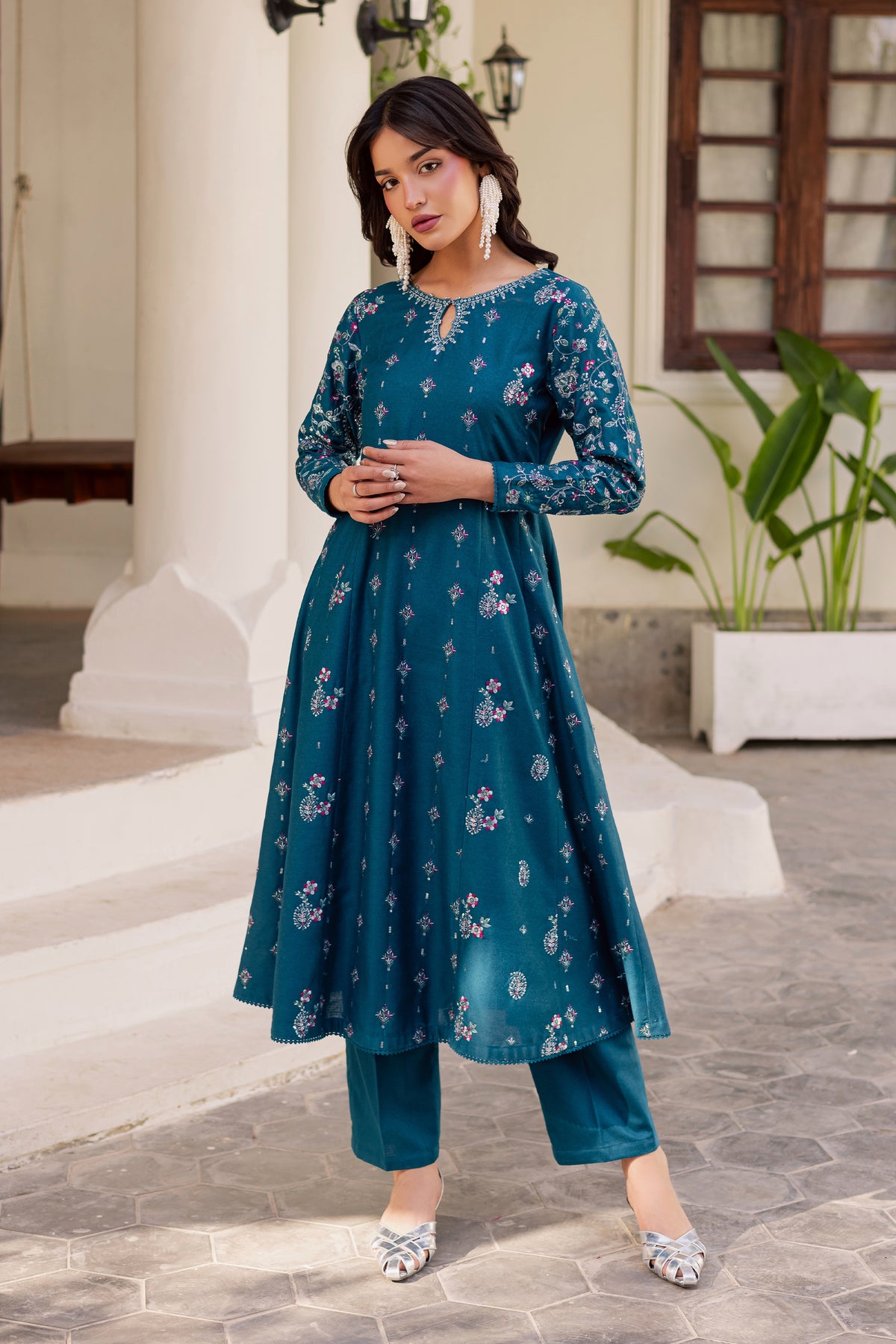This paneled ocean green embroidered frock is designed with detailed craftsmanship and features heavily embroidered sleeves finished with delicate lace.