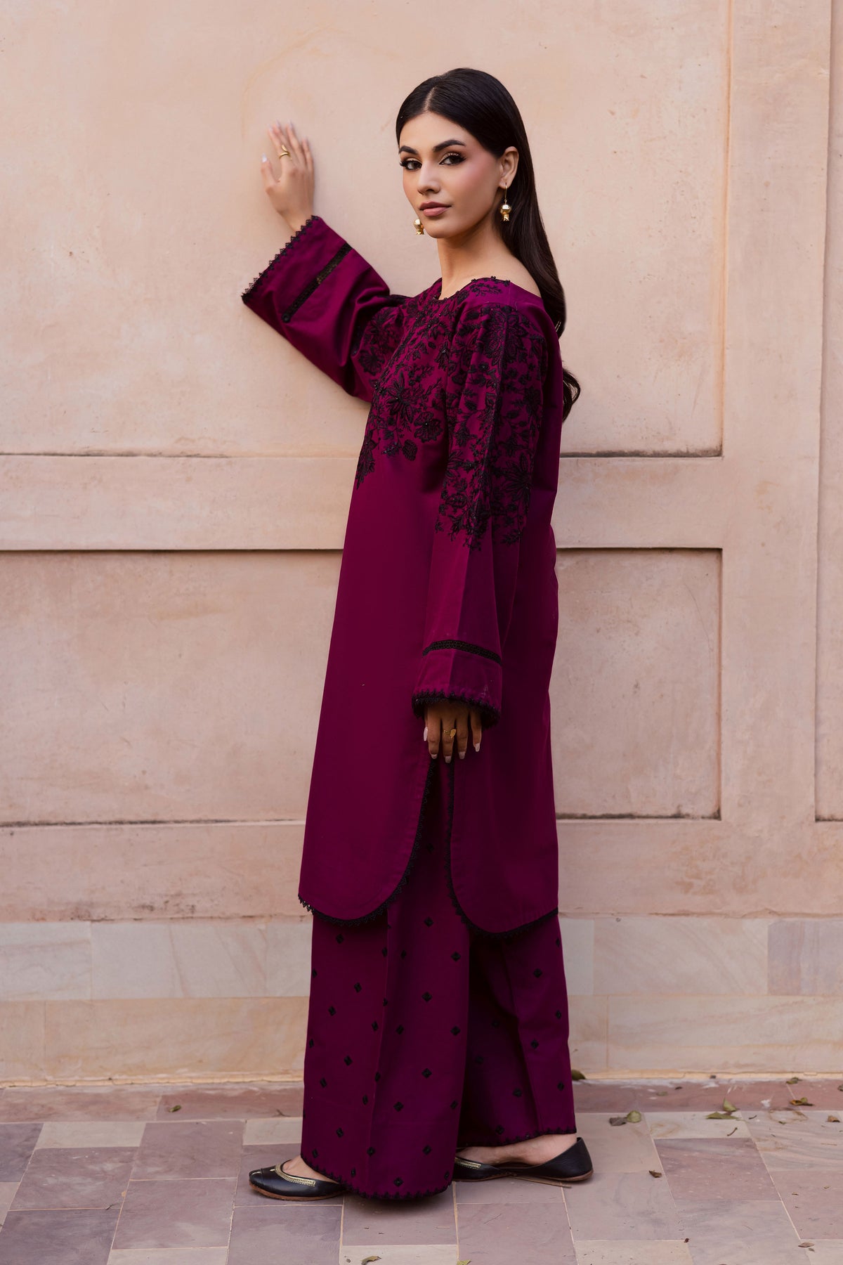 Add a touch of sophistication with this elegant two-piece beetroot khaddar set, featuring an embroidered neckline that seamlessly connects to the sleeves. The front and sleeves are beautifully embellished with pearls, creating a delicate and luxurious finish that captures timeless femininity.