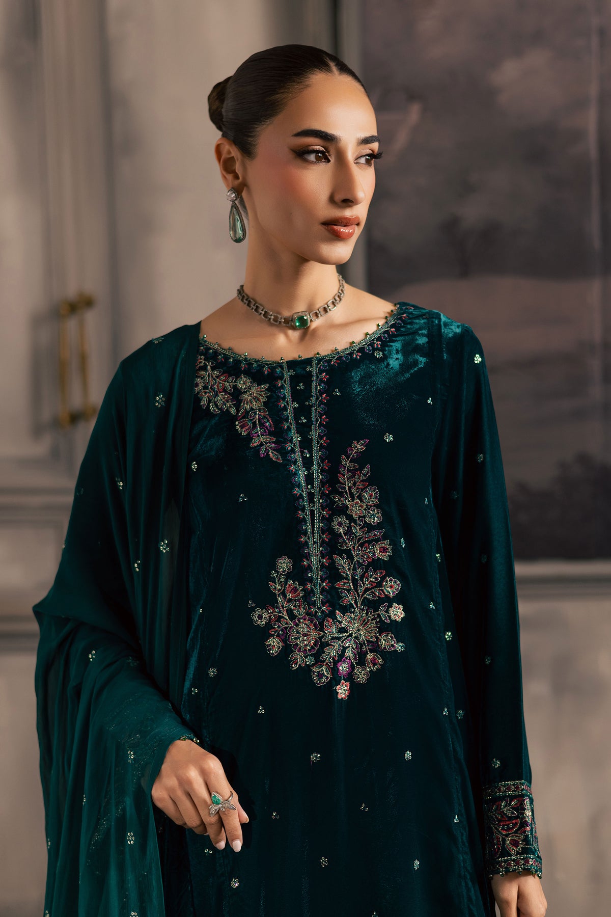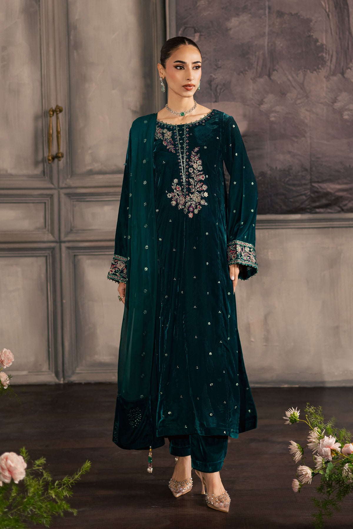 A chiffon dupatta with a sequin spray and a velvet pallu border completes the ensemble, bringing lightness to the rich velvet base.