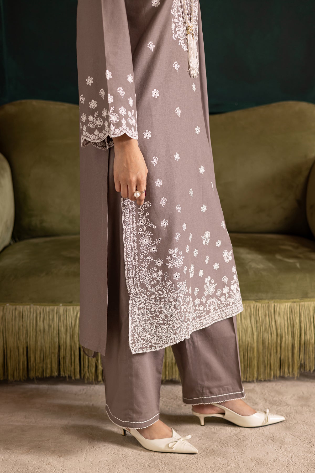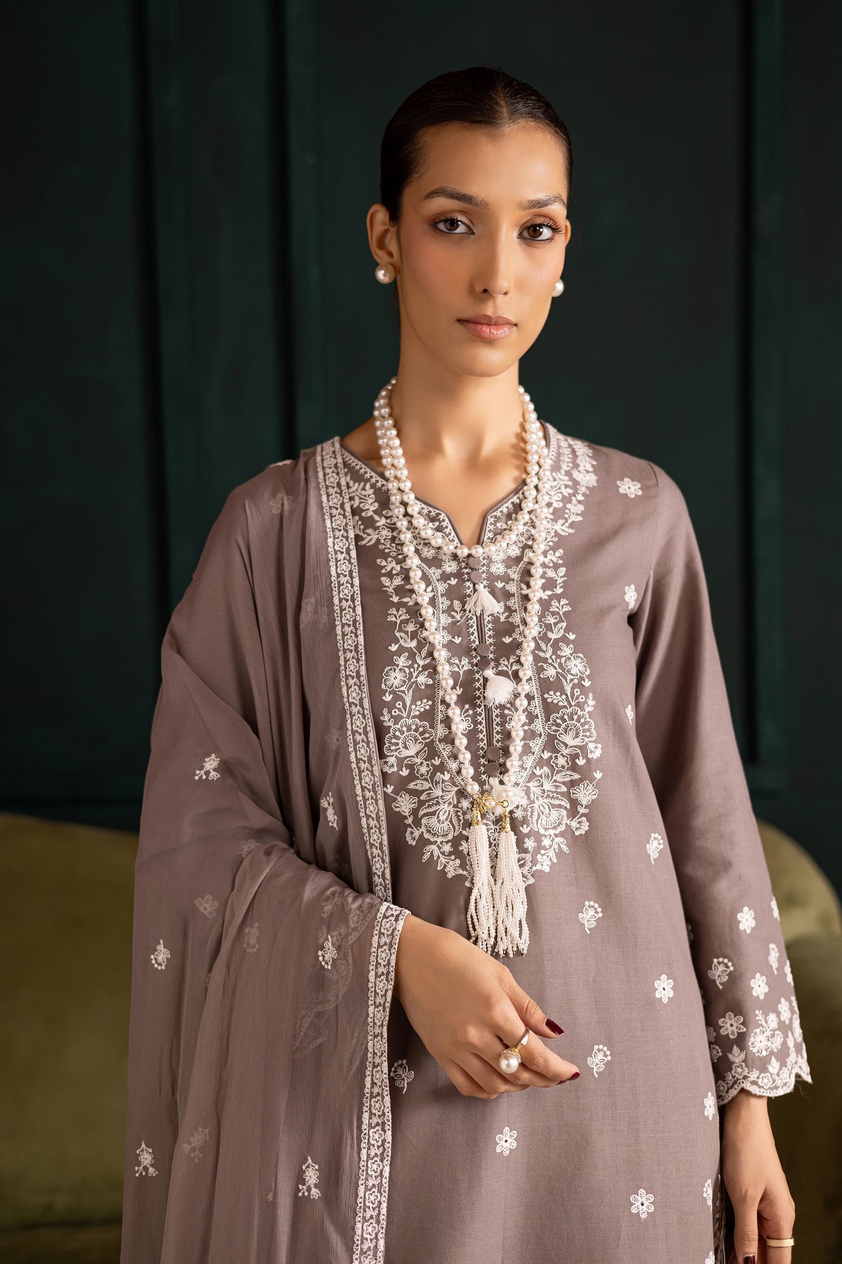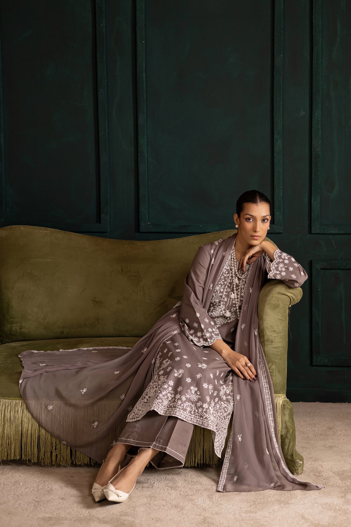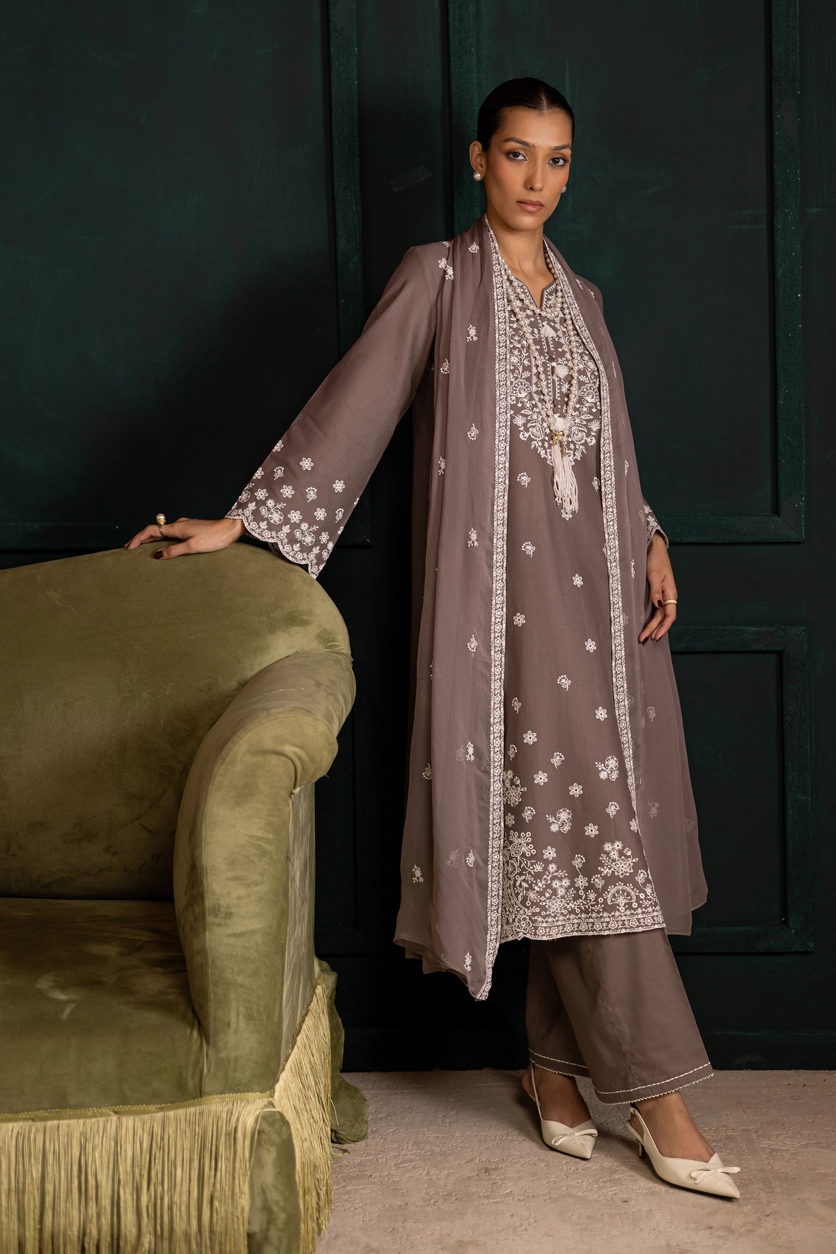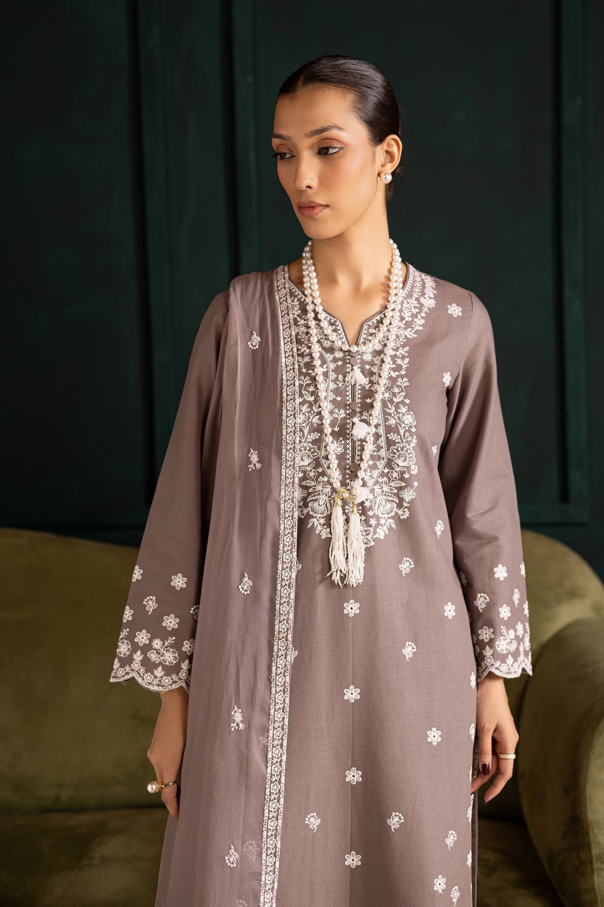 Step into timeless sophistication with this elegant Grey khaddar three-piece ensemble, crafted to make a lasting impression. The fully embroidered shirt serves as the centerpiece of the outfit, showcasing intricate detailing that adds depth and texture to the overall design. The neckline is beautifully finished with a refined collage, lending a graceful and polished touch that enhances the outfit’s formal appeal.