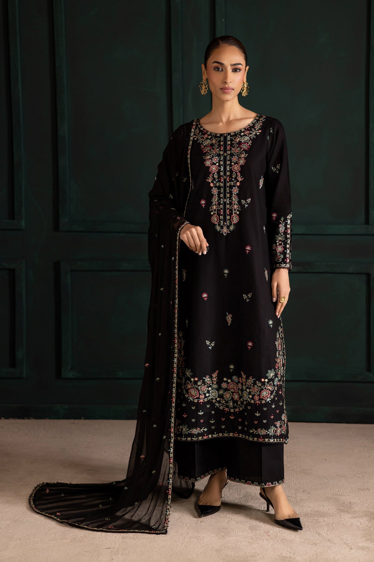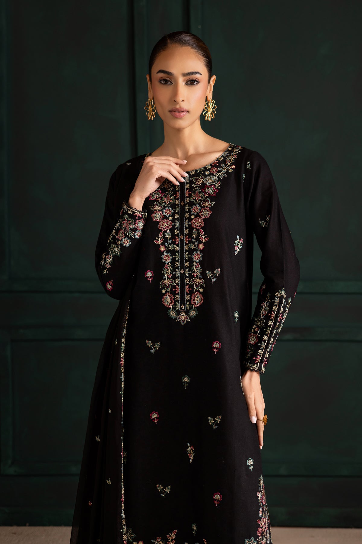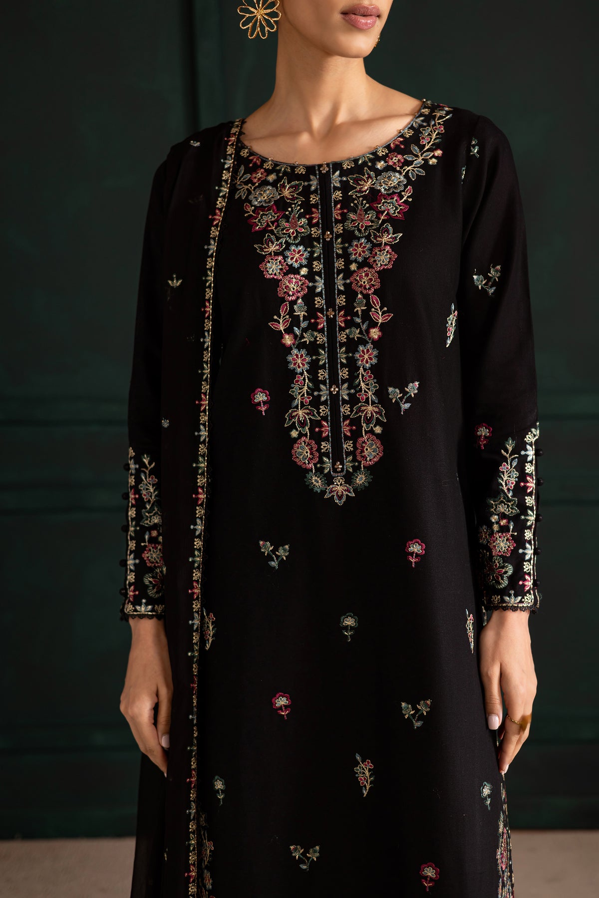 Embrace timeless elegance with the Night Flower three-piece set, featuring a long black khaddar shirt with an all-over embroidery spread and a heavily embroidered neckline. The hem is detailed with composed embroidery and finished with delicate lace, while the fitted sleeves are adorned with embroidery, lace accents, and button detailing for a sophisticated finish.