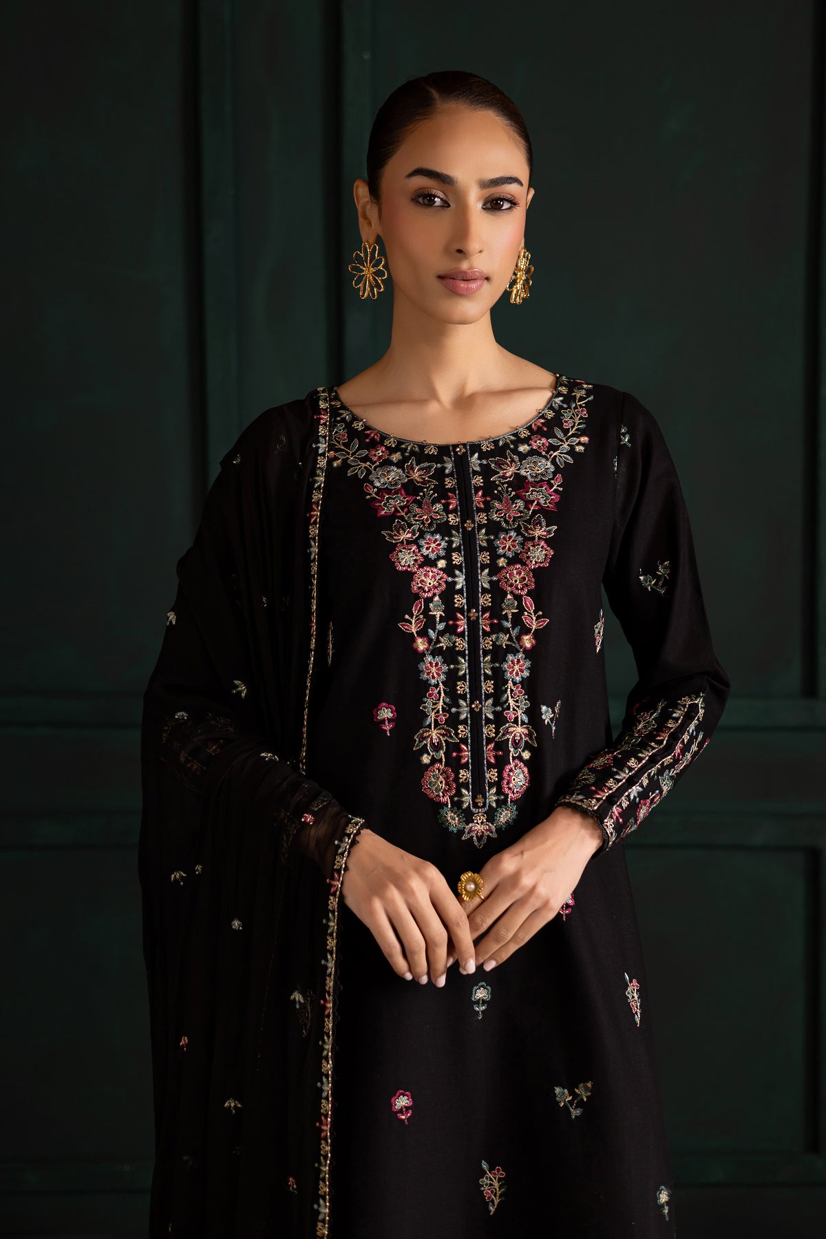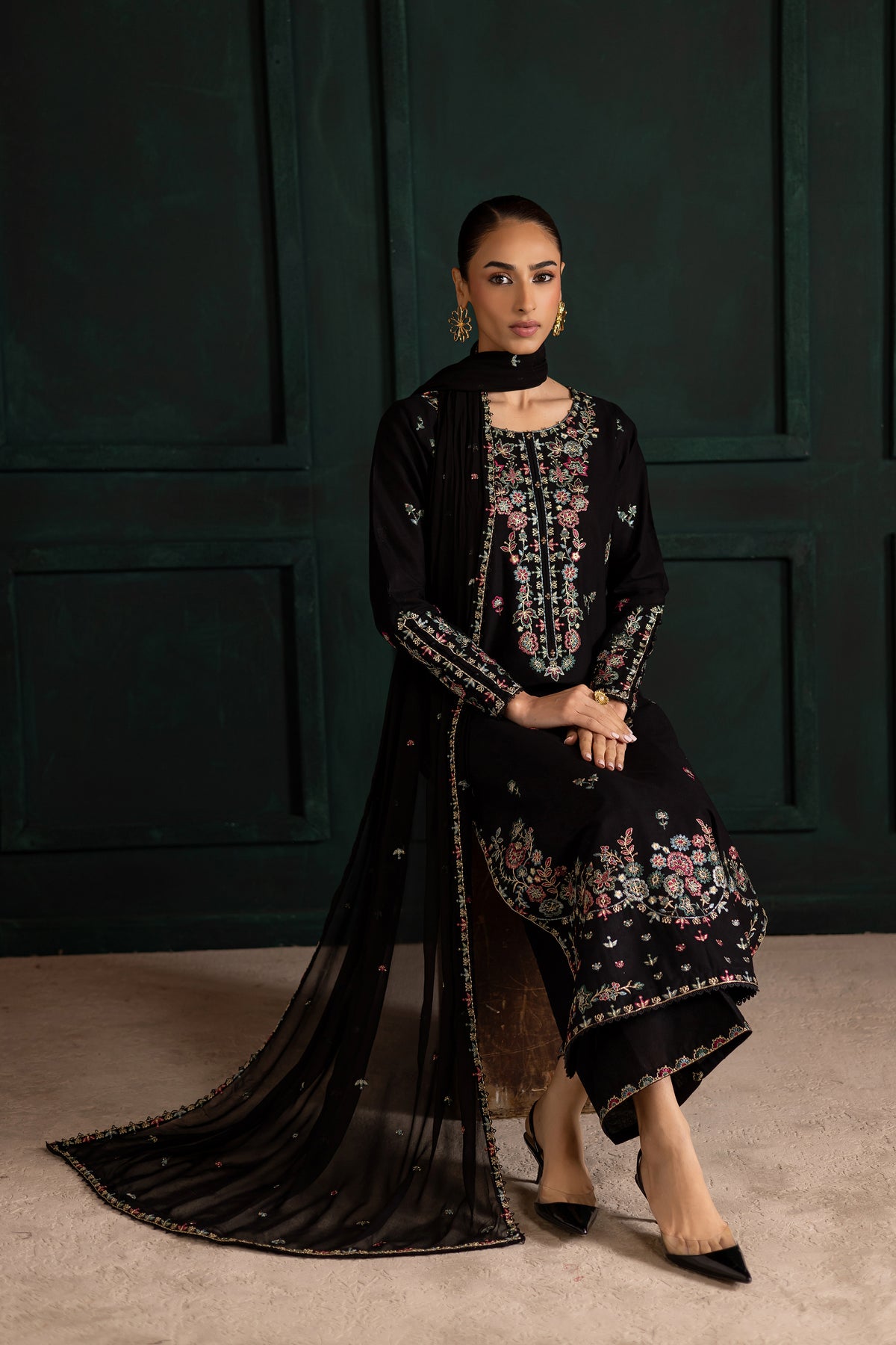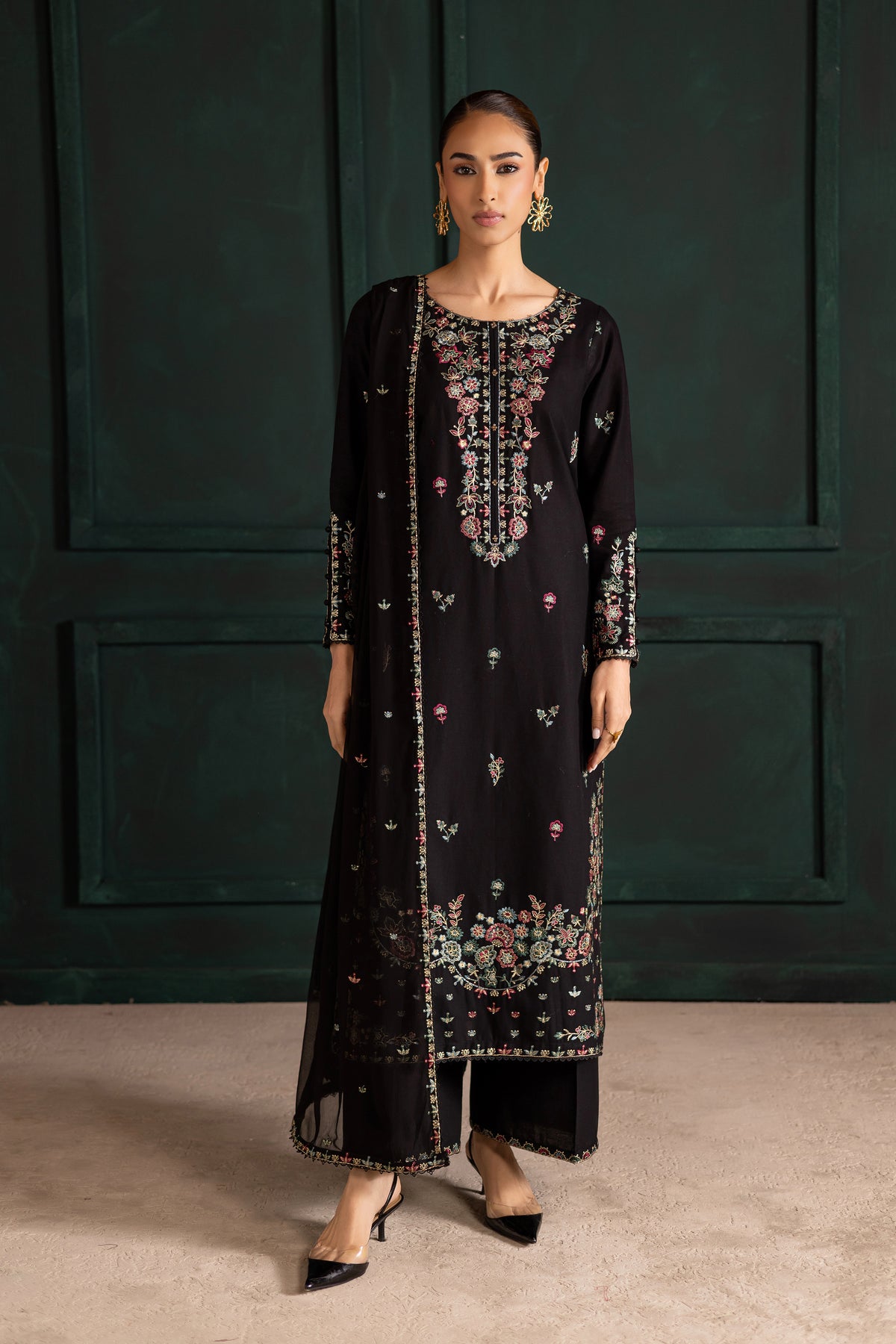 Embrace timeless elegance with the Night Flower three-piece set, featuring a long black khaddar shirt with an all-over embroidery spread and a heavily embroidered neckline. The hem is detailed with composed embroidery and finished with delicate lace, while the fitted sleeves are adorned with embroidery, lace accents, and button detailing for a sophisticated finish.