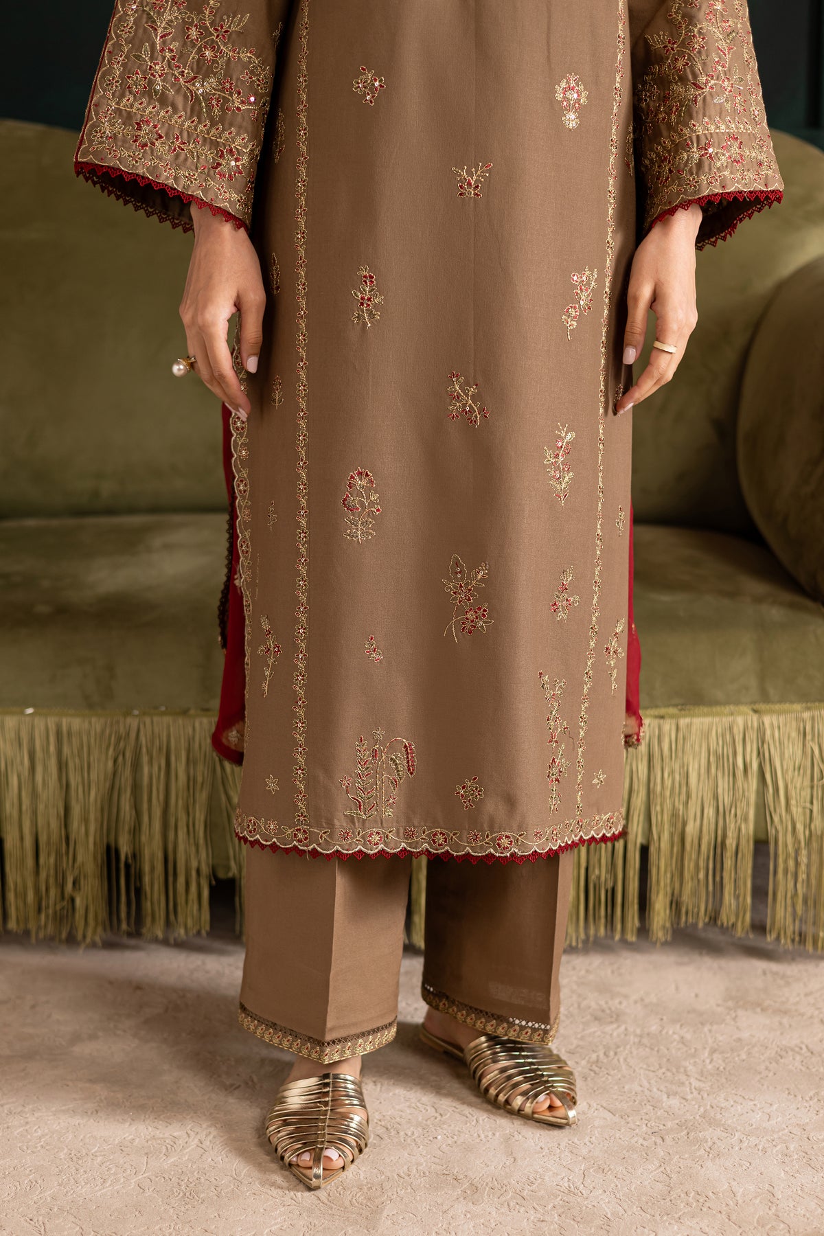 Indulge in graceful charm with the Tiramisu three-piece light brown khaddar set, a perfect blend of modern elegance and classic detailing. The long shirt features composed embroidery throughout, with a beautifully scalloped hemline finished in contrast lace, adding a refined yet striking touch. The flared sleeves are adorned with composed embroidery and detailed with lace attachments, offering a flowy and feminine silhouette.A minimal floral collage on the neckline adds a delicate accent, keeping the look balanced and sophisticated.